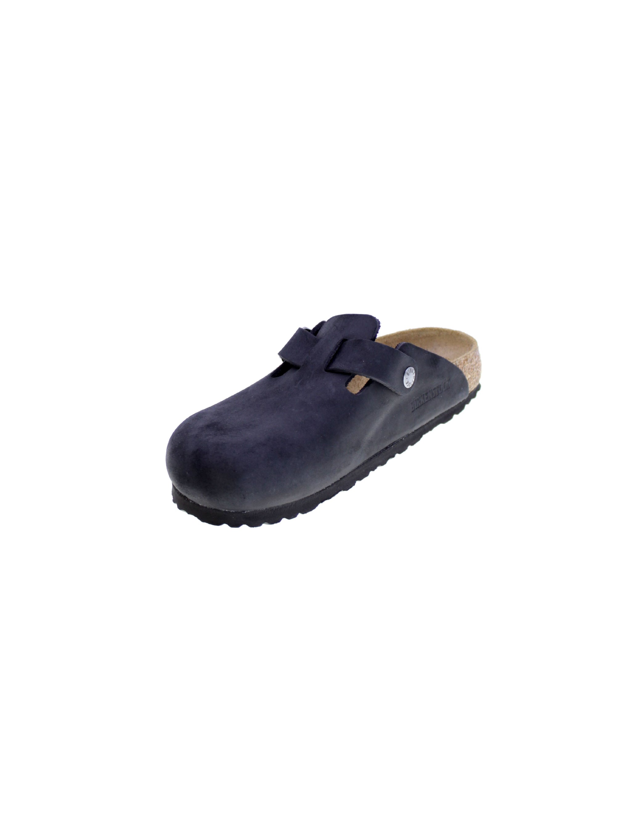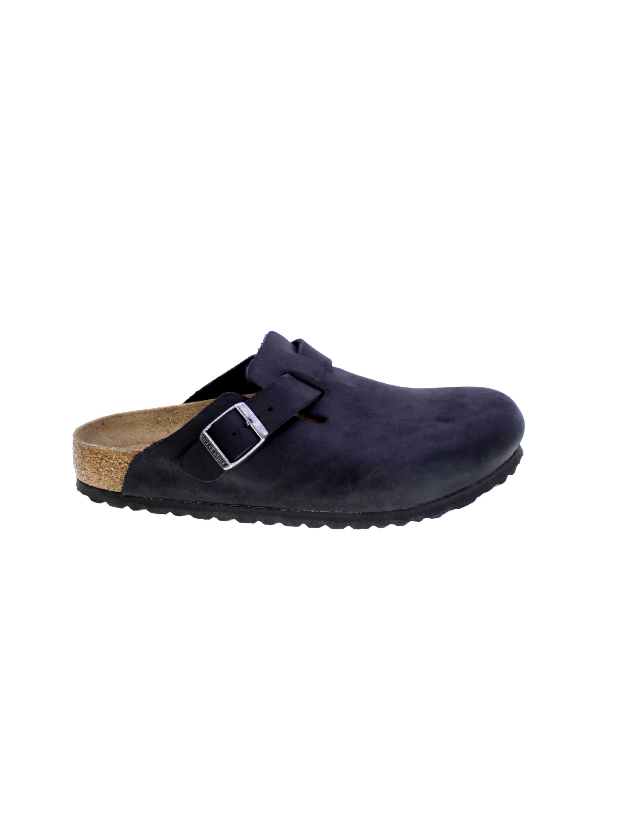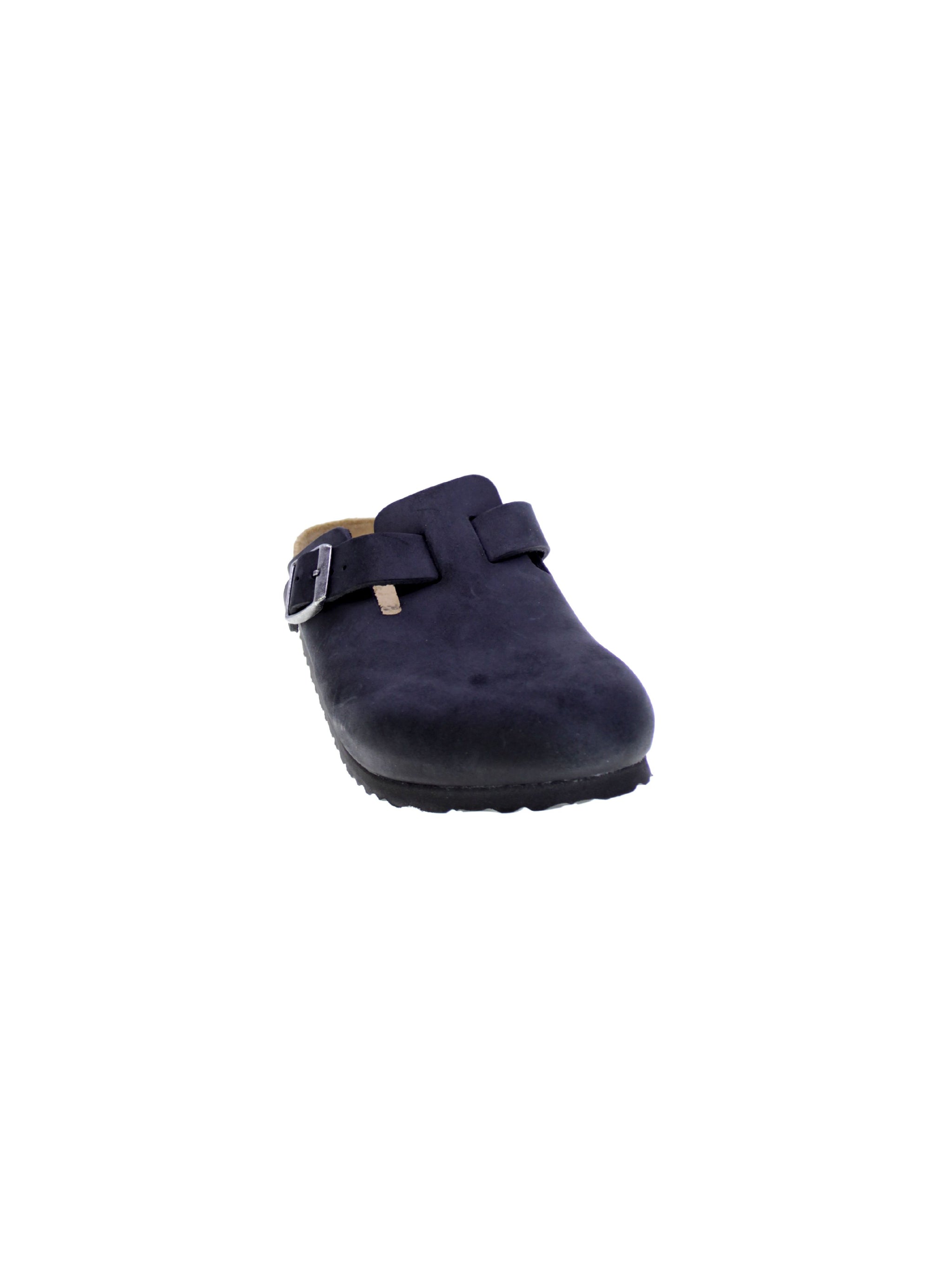 Sabot in pelle oliata colore nero, fibbia regolabile.