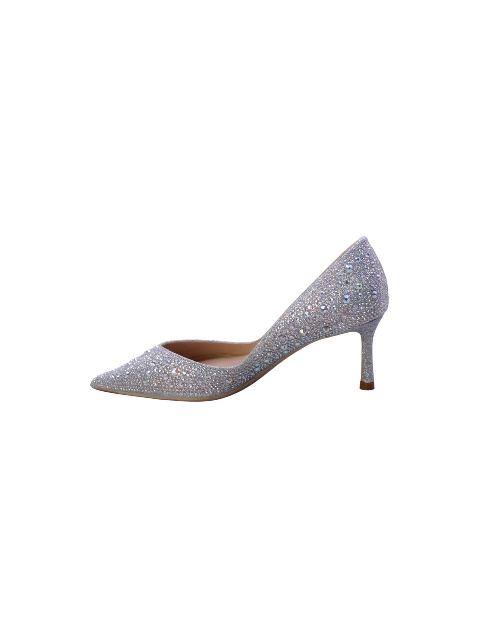 Decollete mignon pietre effetto swaroski argento, rivestimento interno in vegano, sottopiede morbido in pelle, tacco rivestito lurex in tinta 60mm, suola sintetico gomma antiscivolo.