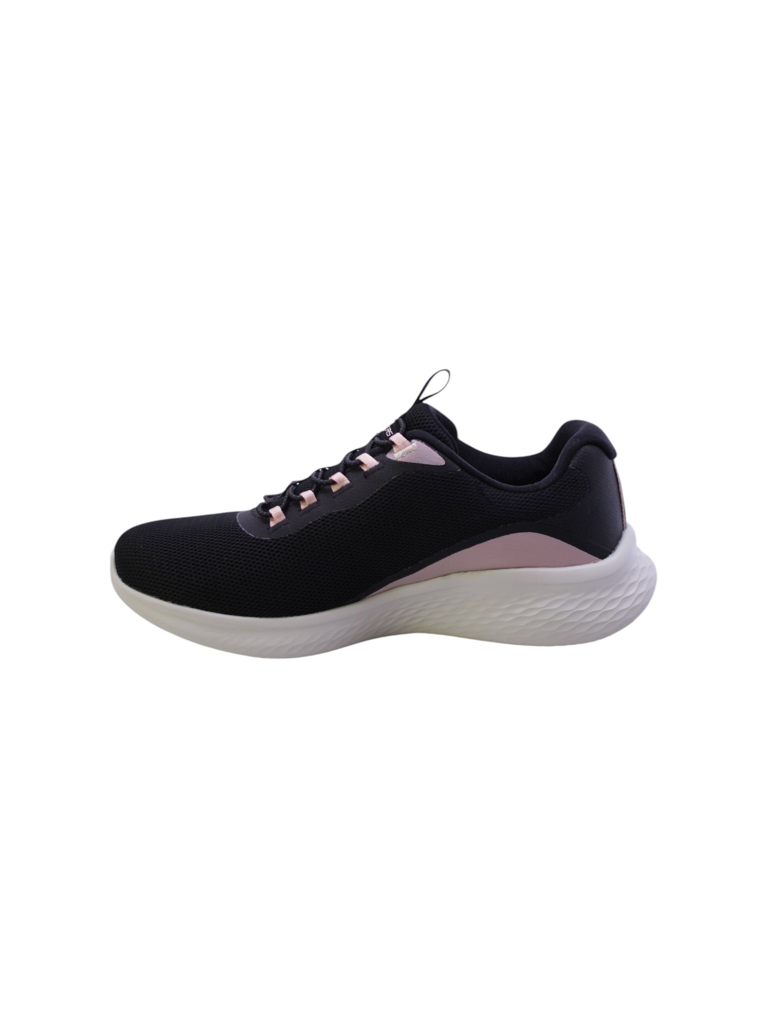 Sneakers realizzata in tessuto rete colore nero, inserti in neoprene nero e rosa, 5 asole fettuccia rosa con lacci elastico non regolabile, interno linguetta elastico per facilitare la calzata, rivestimento in tessuto traspirante, sottopiede comfort Memory Foam, suola gomma leggera.