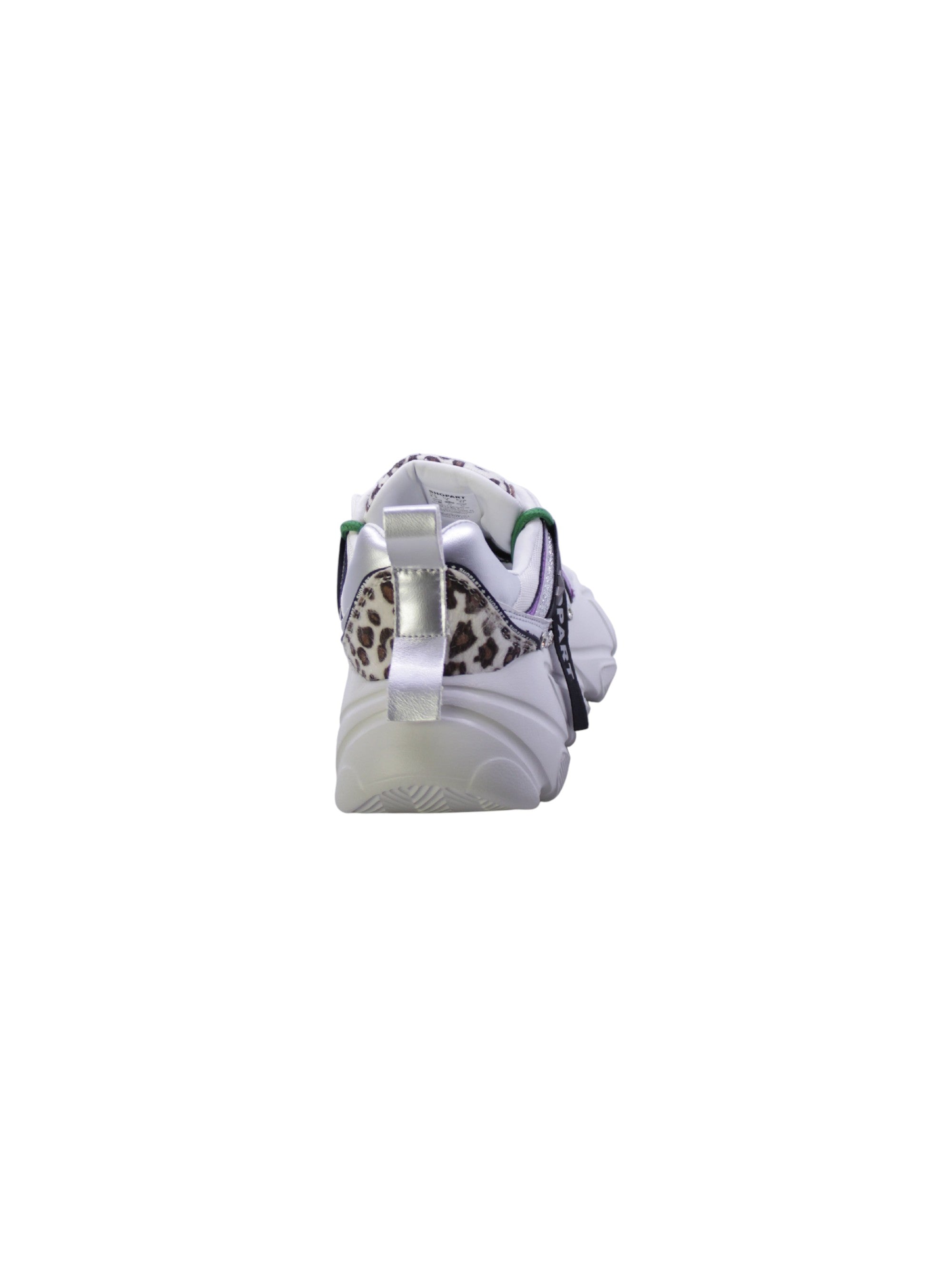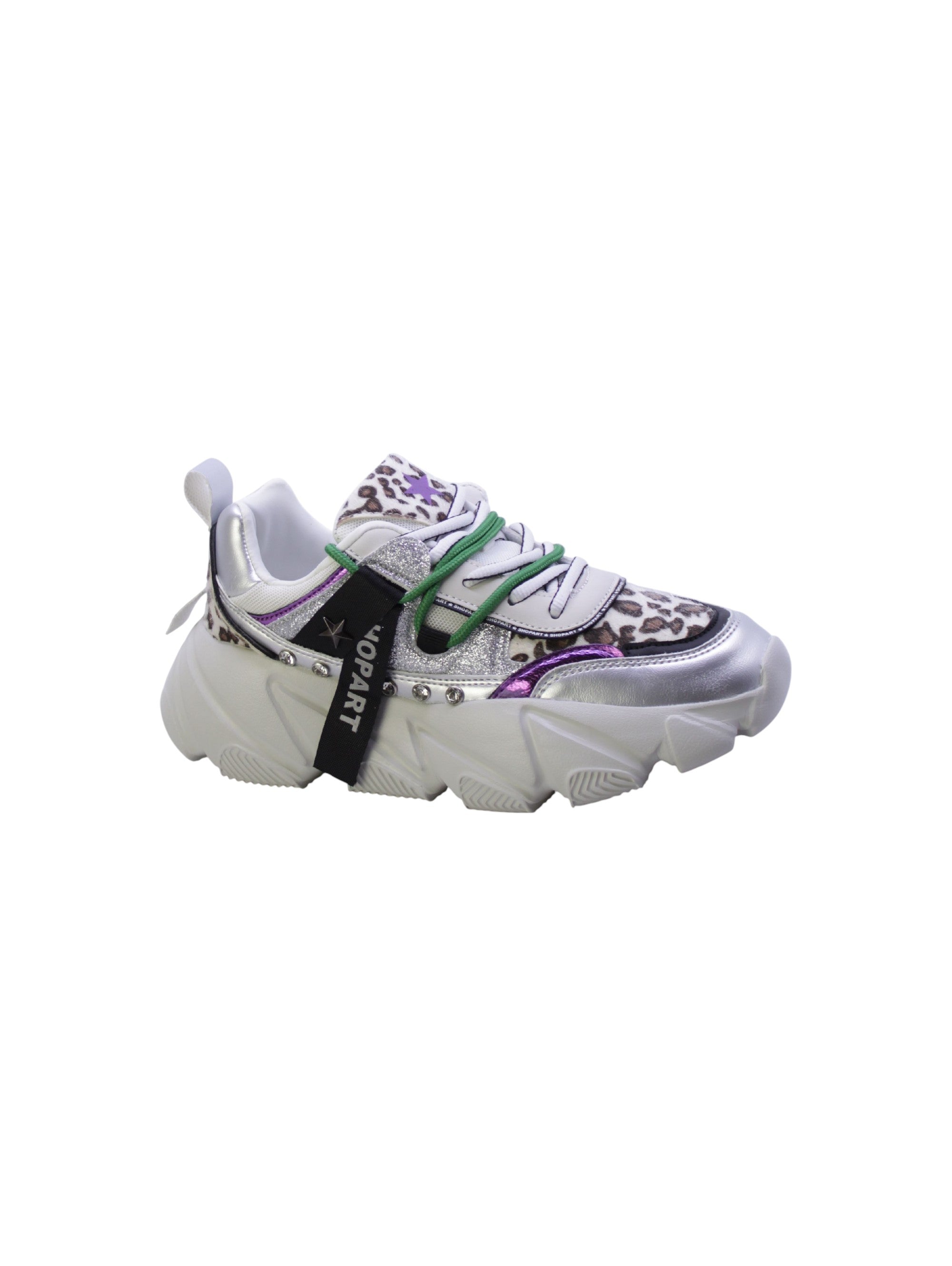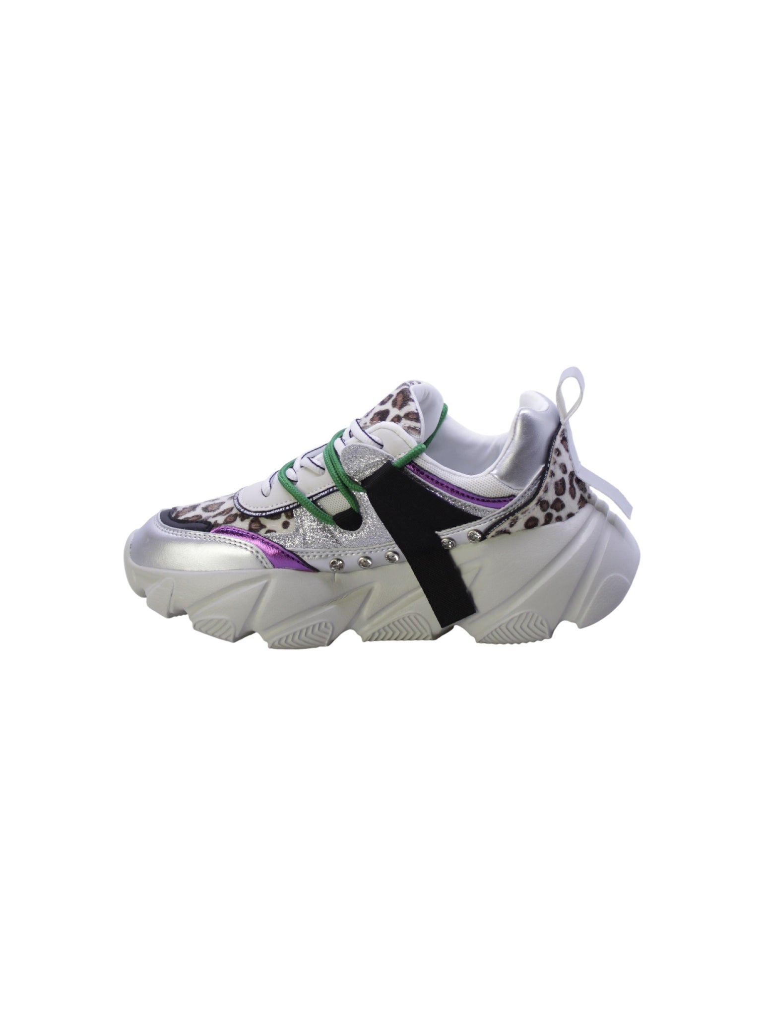 Sneakers chunky in ecopelle e tessuto colore multicolor argento/beige/maculato, logo stampato su nastrino lateral, 5 occhielli +2 asole con lacci bianco e verde, interno in simil pelle, sottopiede estraibile in ecopelle, suola in gomma beige oversize dentata.
