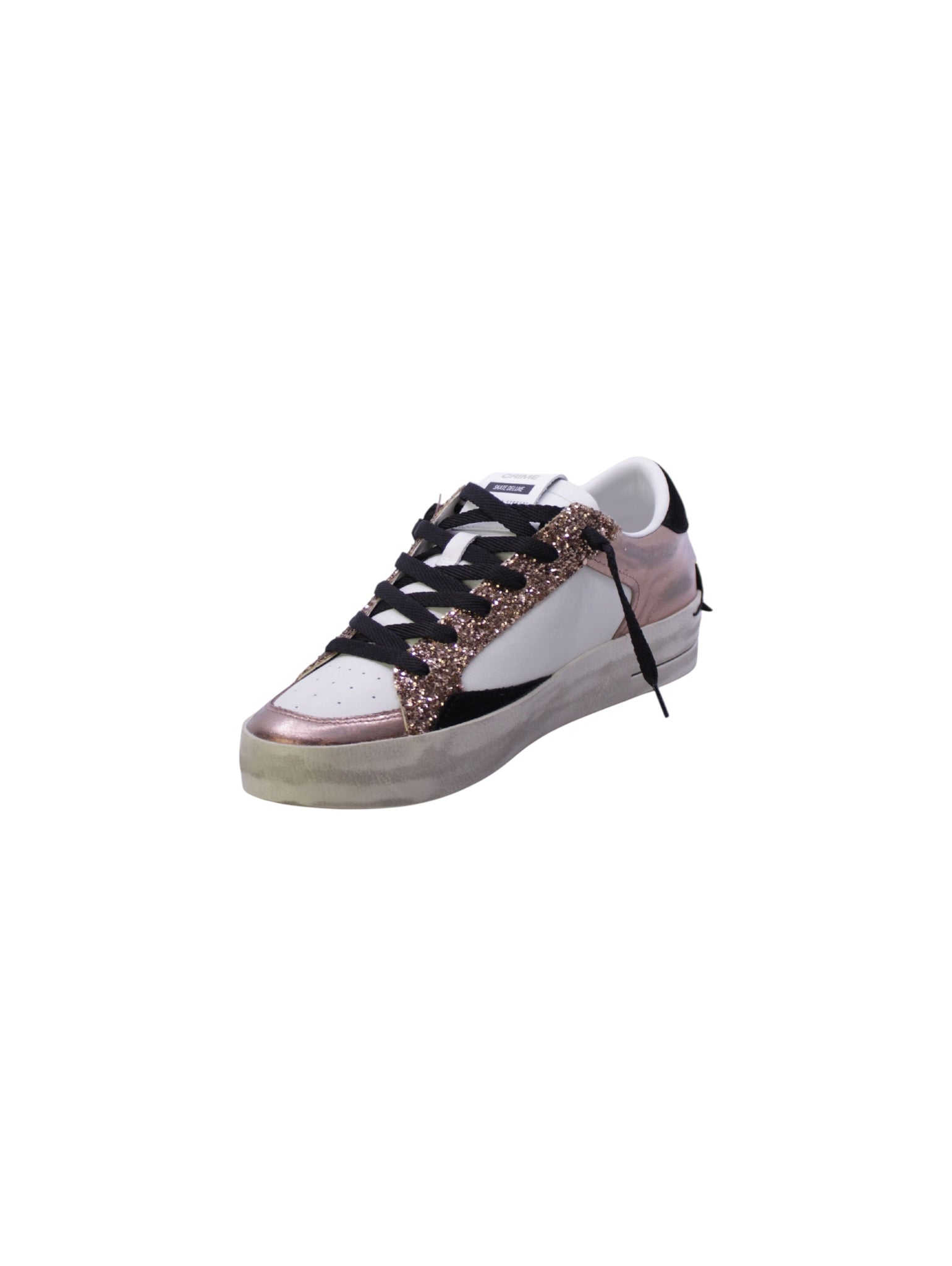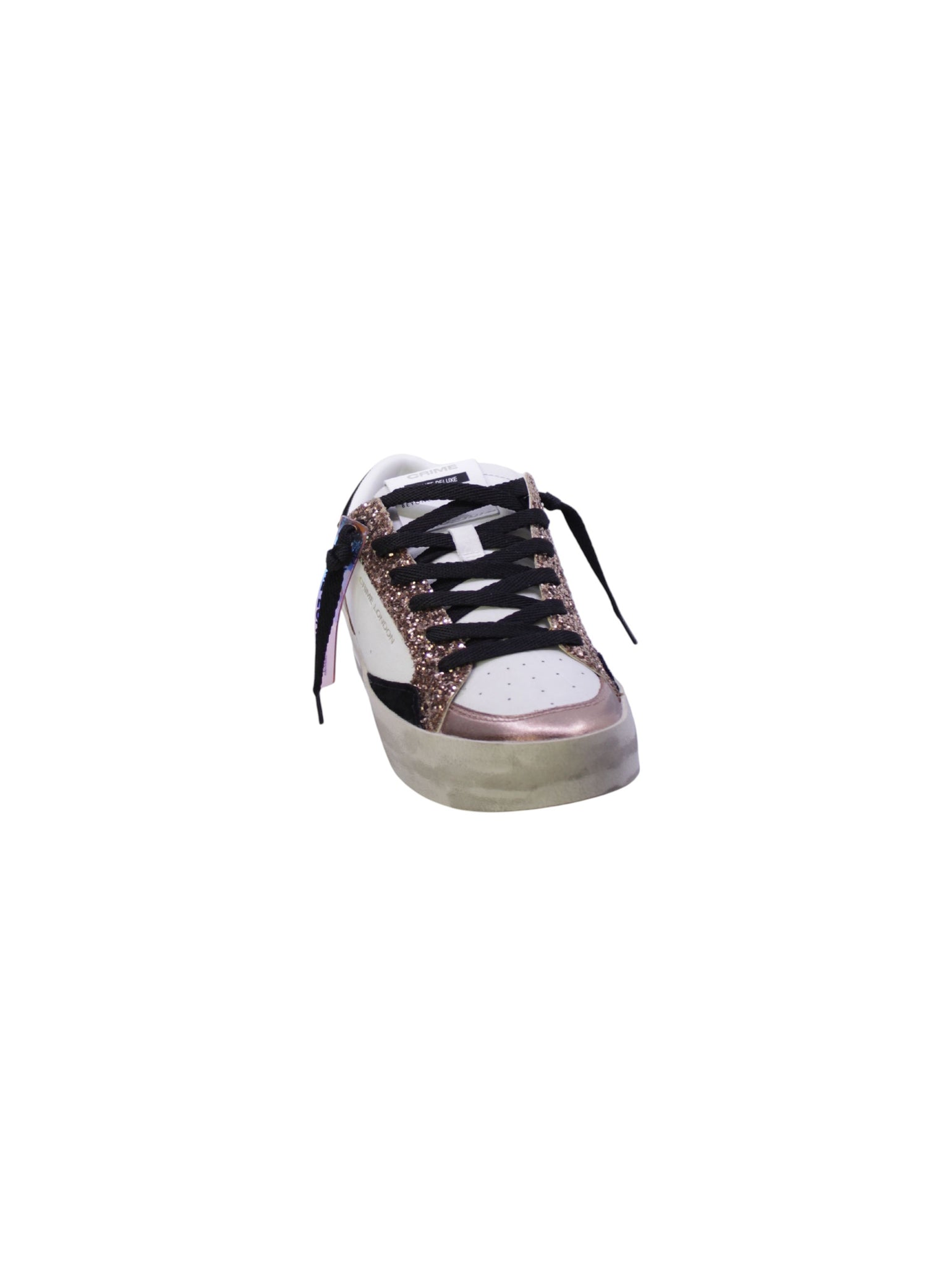 Sneakers allacciata bassa con tomaia pelle colore bianco con accenni di perforazione, inserti laterali camoscio nero, passa lacci glitter rosato6 occhiellicon lacci nero, toppino camoscio nero con logo, puntale e tallone in pelle rosato laminato,rivestimento interno in tessuto spugna, sottopiede removibile morbido in pelle rialzo 20mm, suola gomma effetto used bicolore con patch nero.
