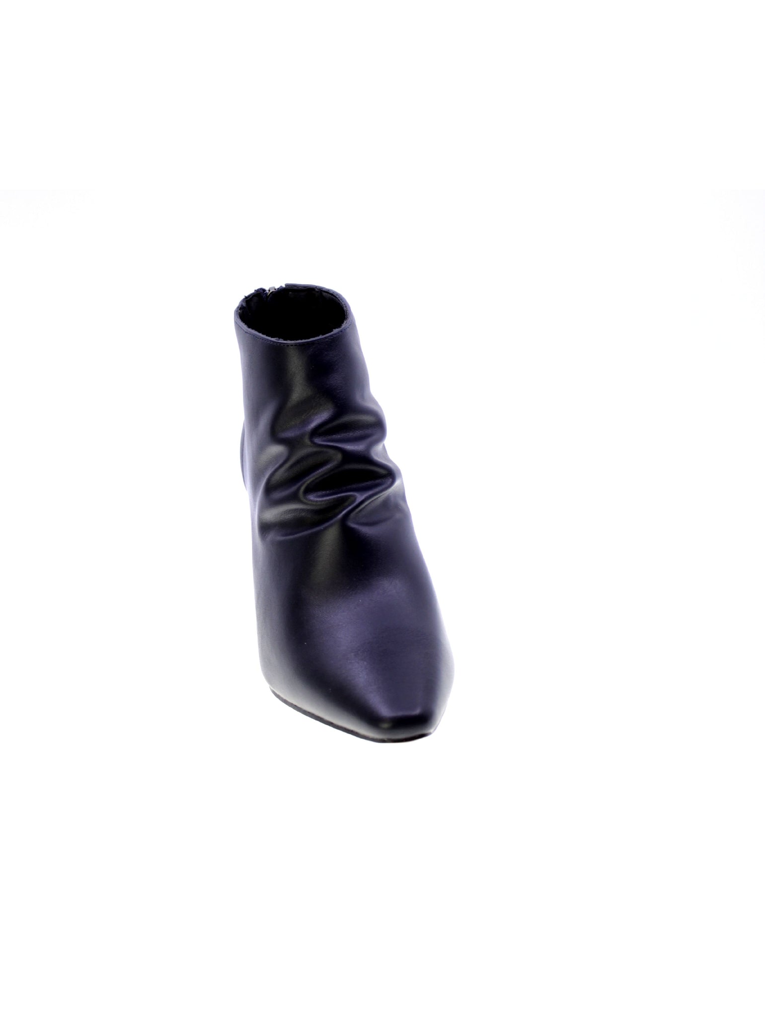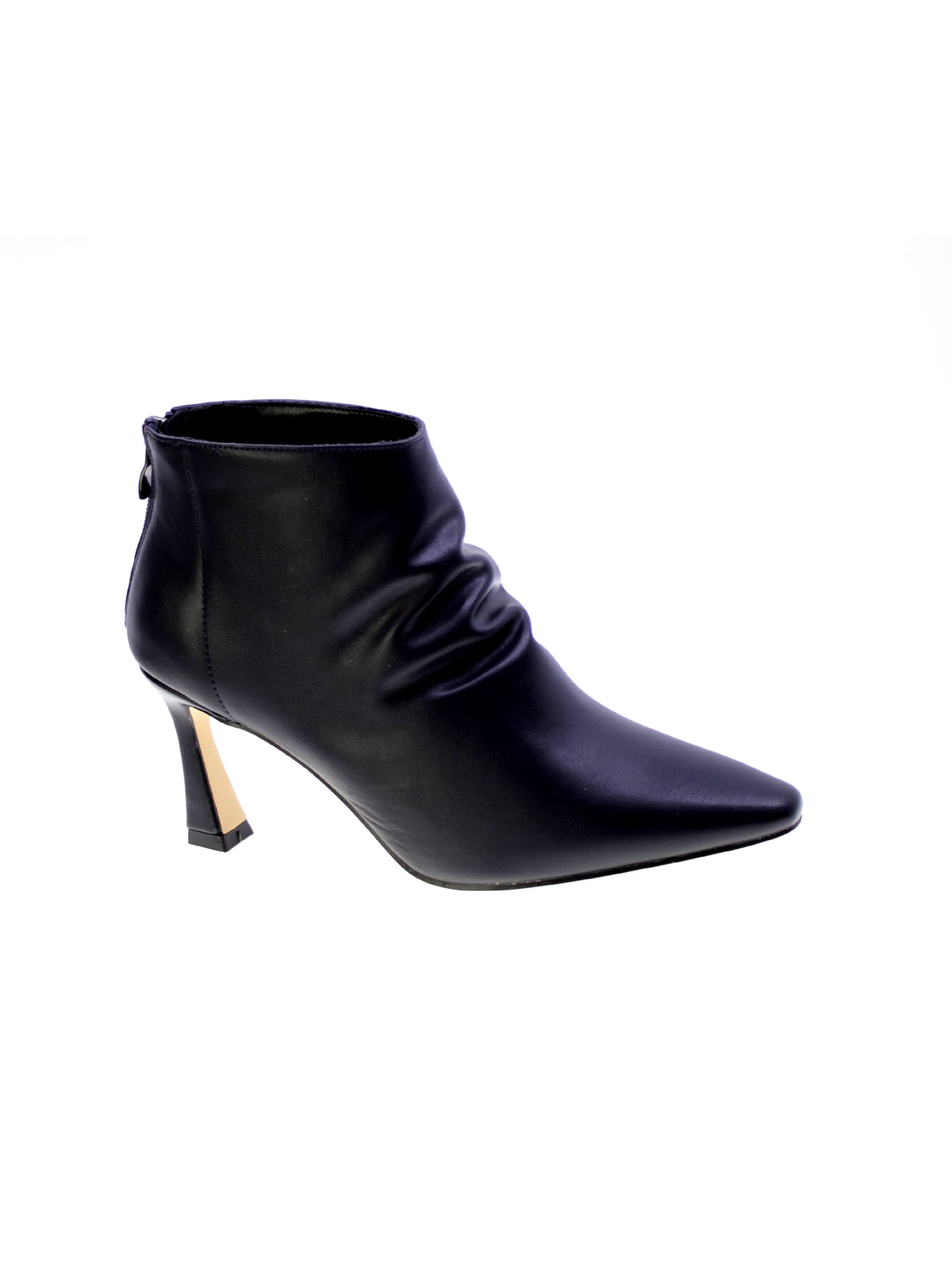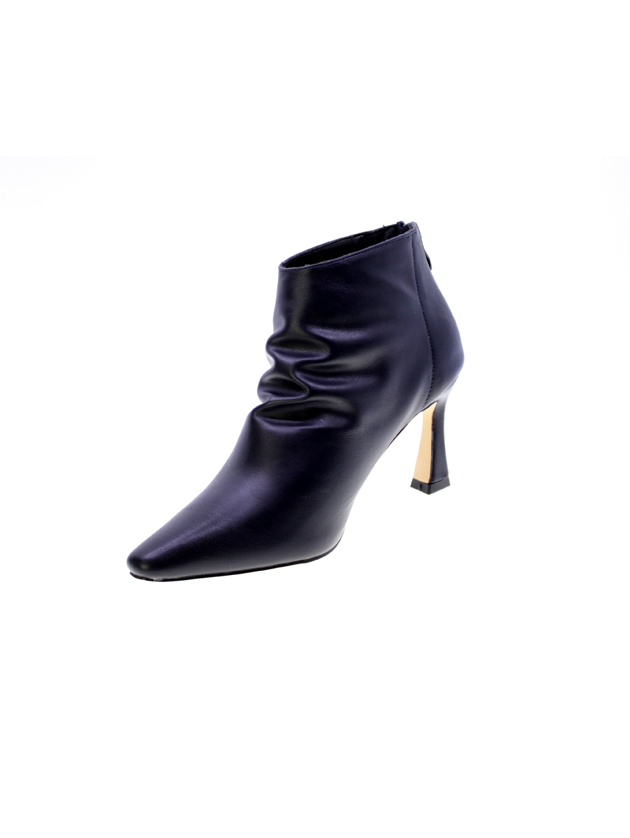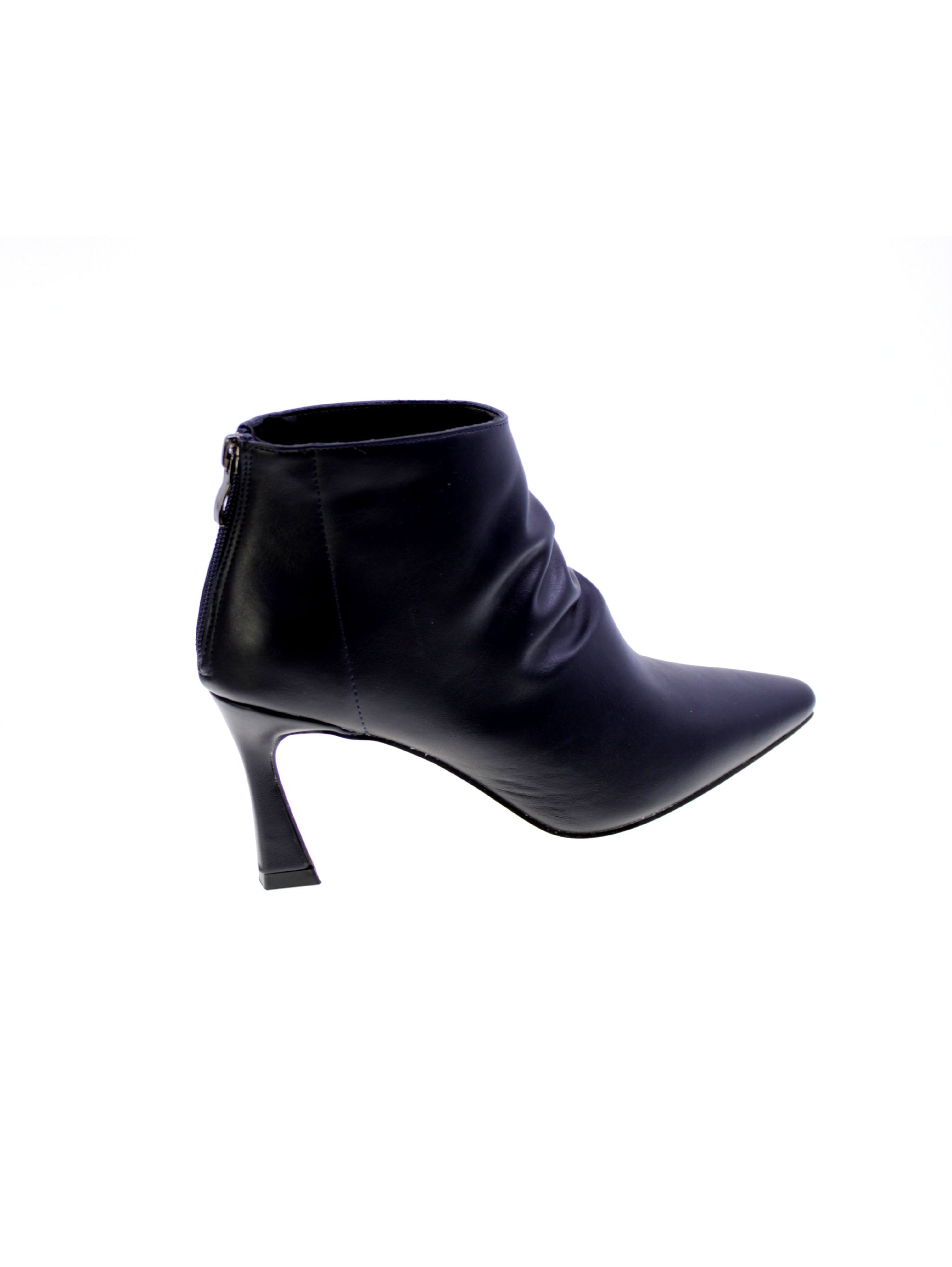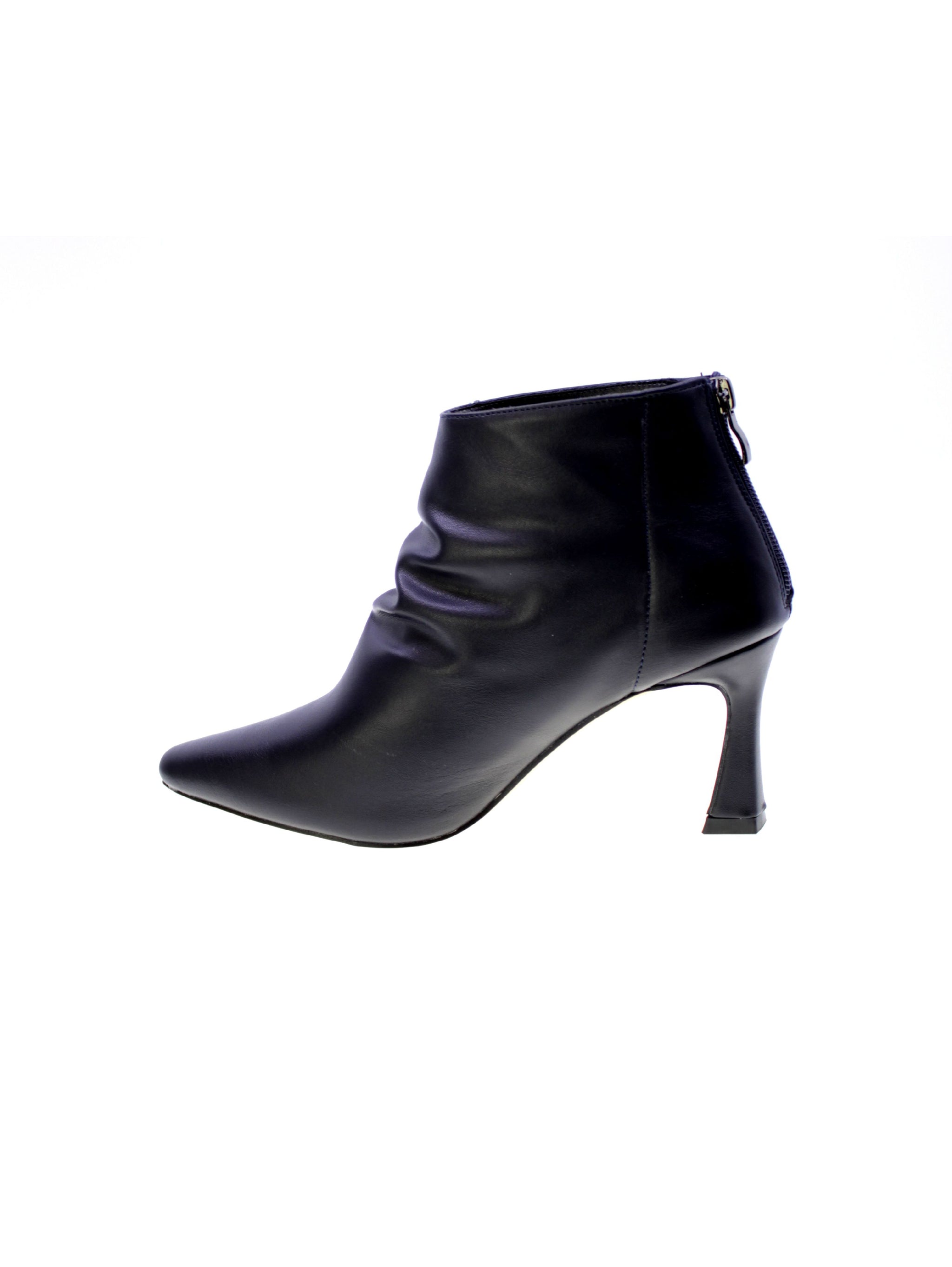 Tronchetto in morbido vegano colore blue con arricciatura sul gambale anteriore, zip su tallone per facilitare la calzata, rivestimento interno in tessuto traspirante, sottopiede morbido in vegano, tacco rivestito 80mm, suola sintetico antiscivolo.