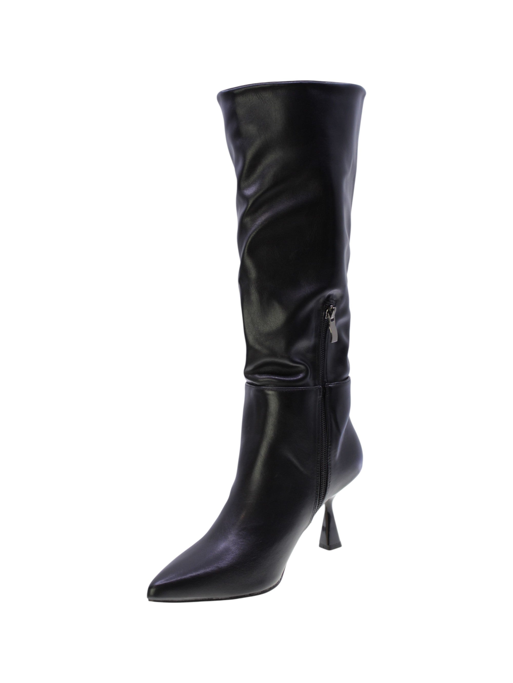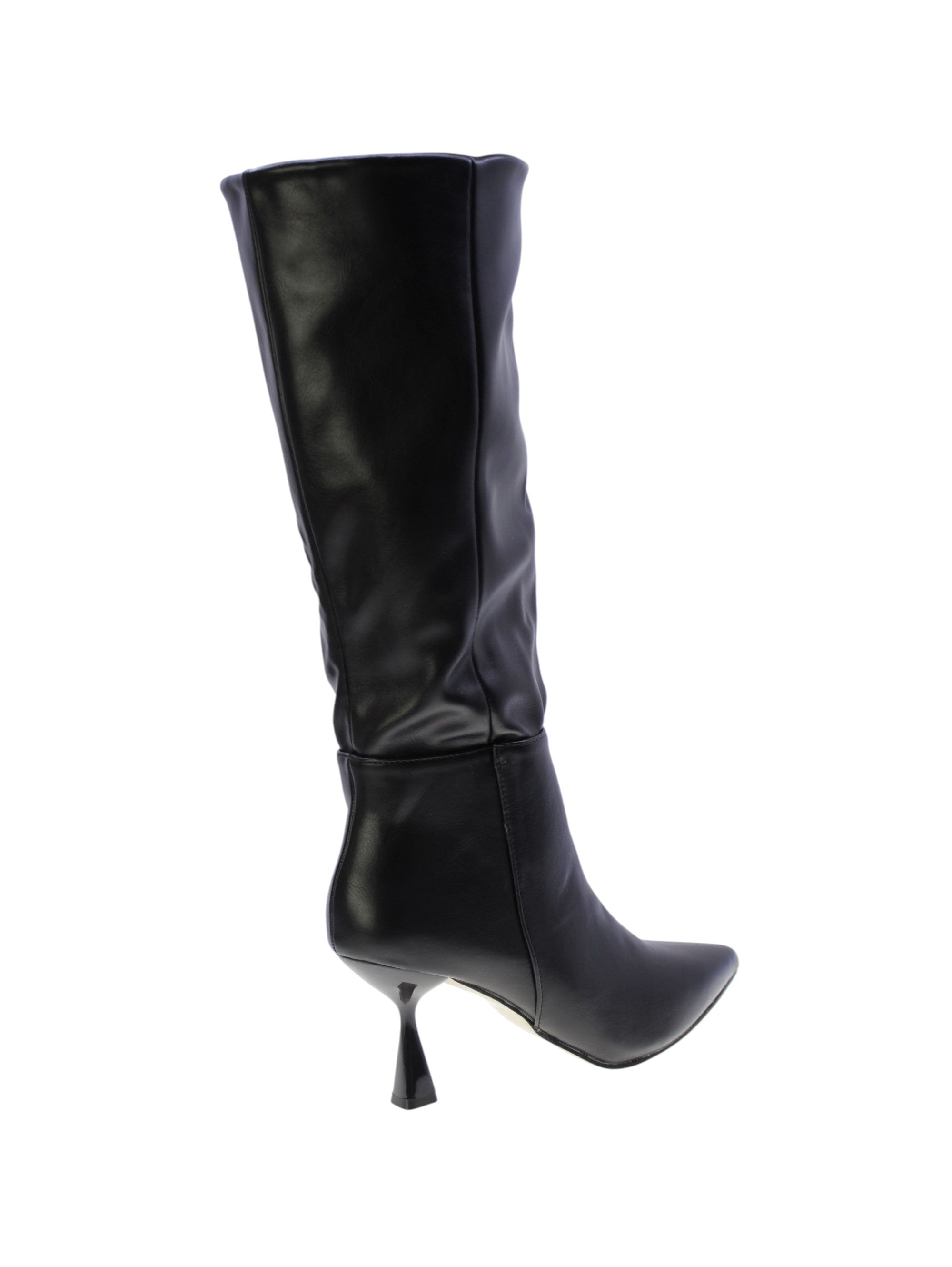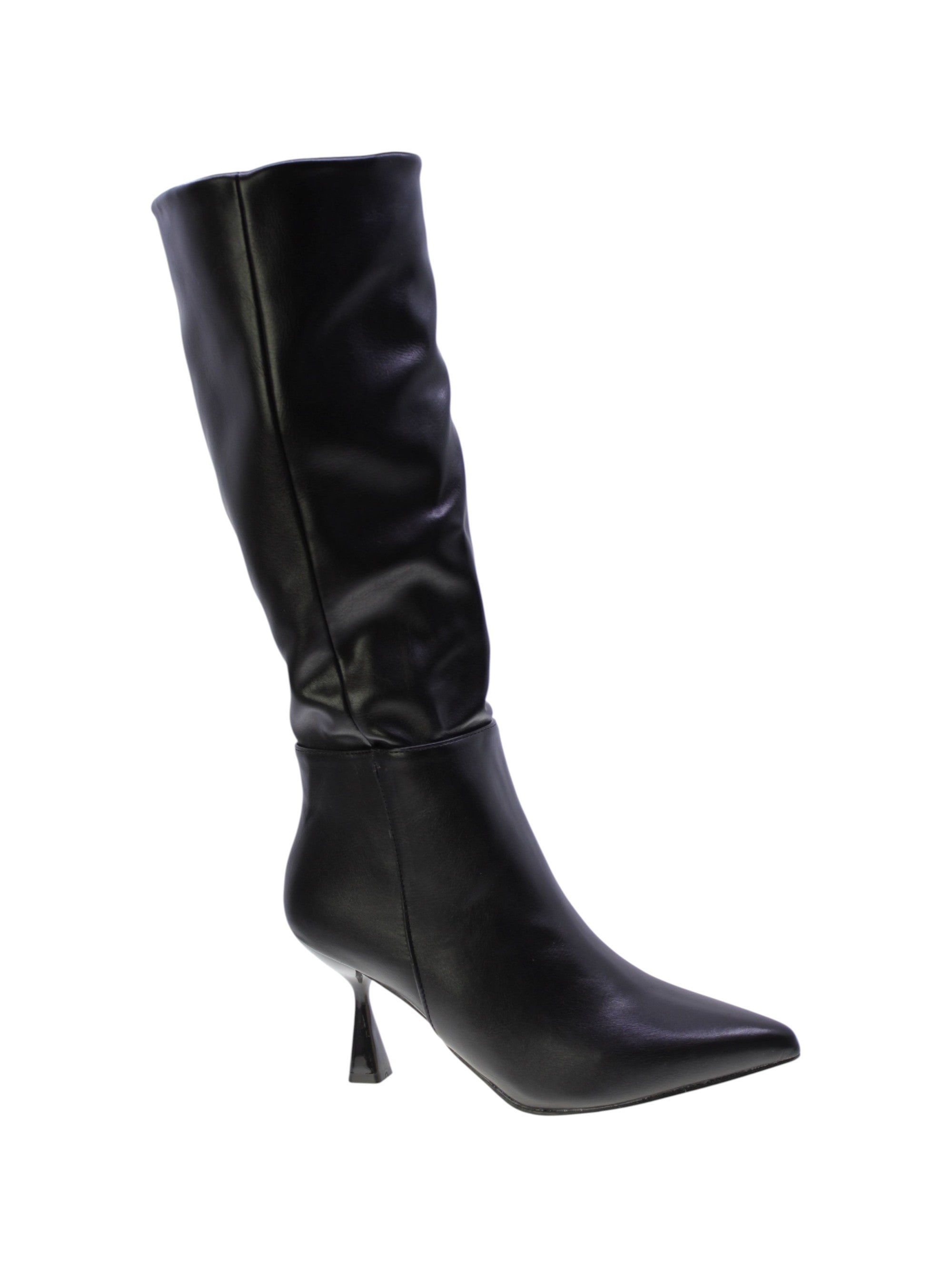Stivale in morbido vegano colore nero con impuntura esterna,zip laterale interna per facilitare la calzata, rivestimento interno in tessuto traspirante,sottopiede morbido in vegano, tacco sintetcio lucido 70mm, suola sintetico antiscivolo.