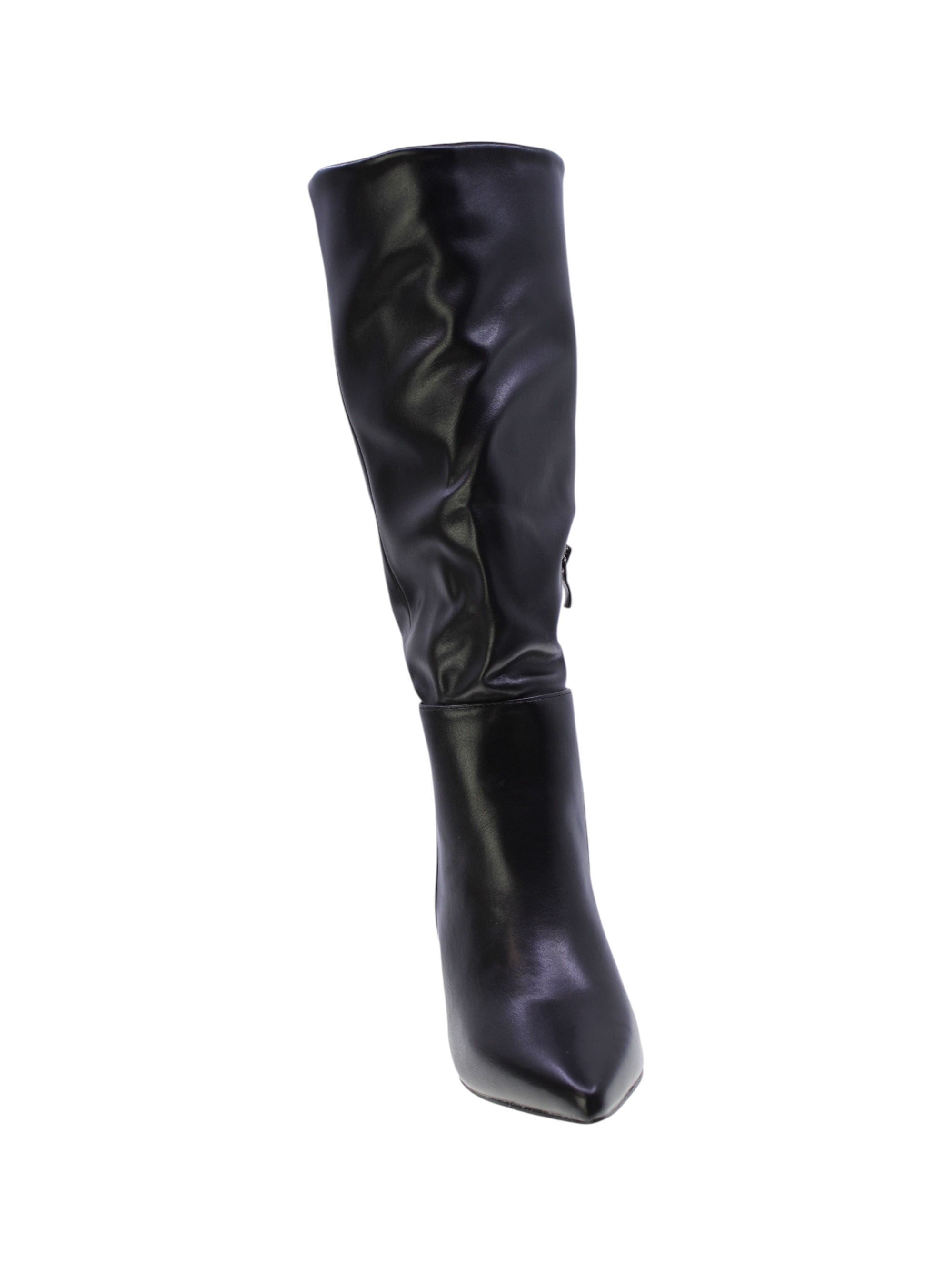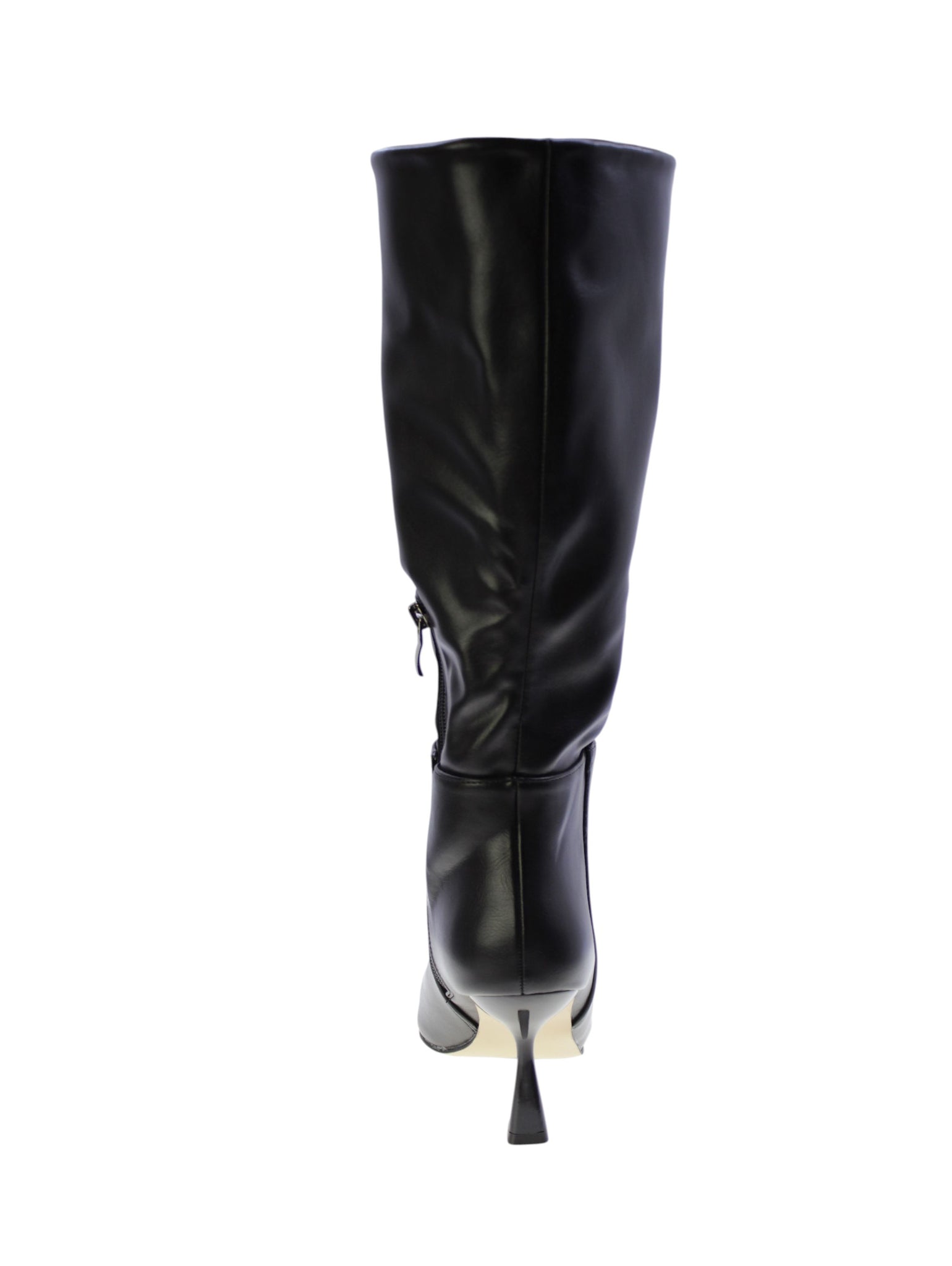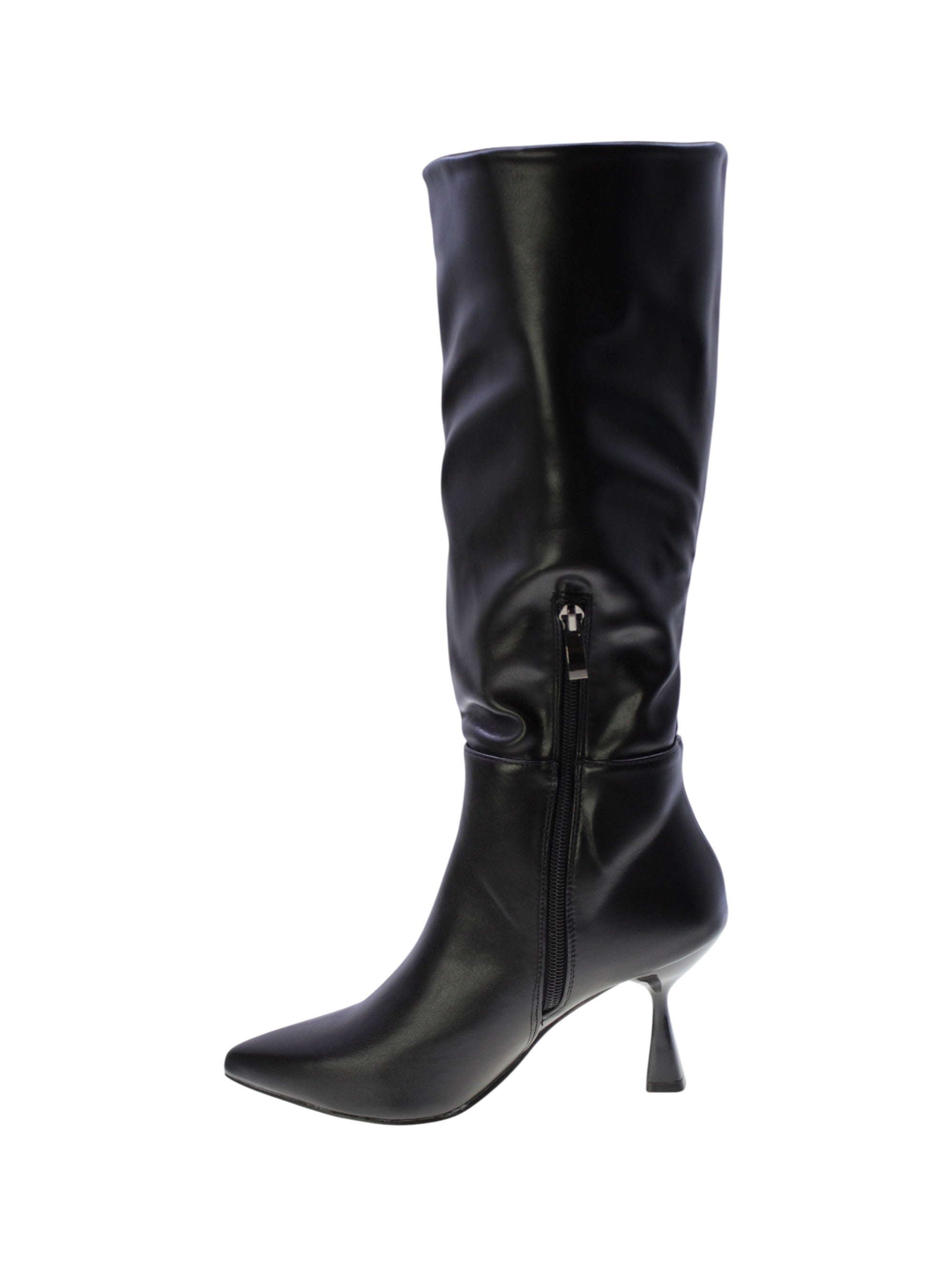 Stivale in morbido vegano colore nero con impuntura esterna,zip laterale interna per facilitare la calzata, rivestimento interno in tessuto traspirante,sottopiede morbido in vegano, tacco sintetcio lucido 70mm, suola sintetico antiscivolo.