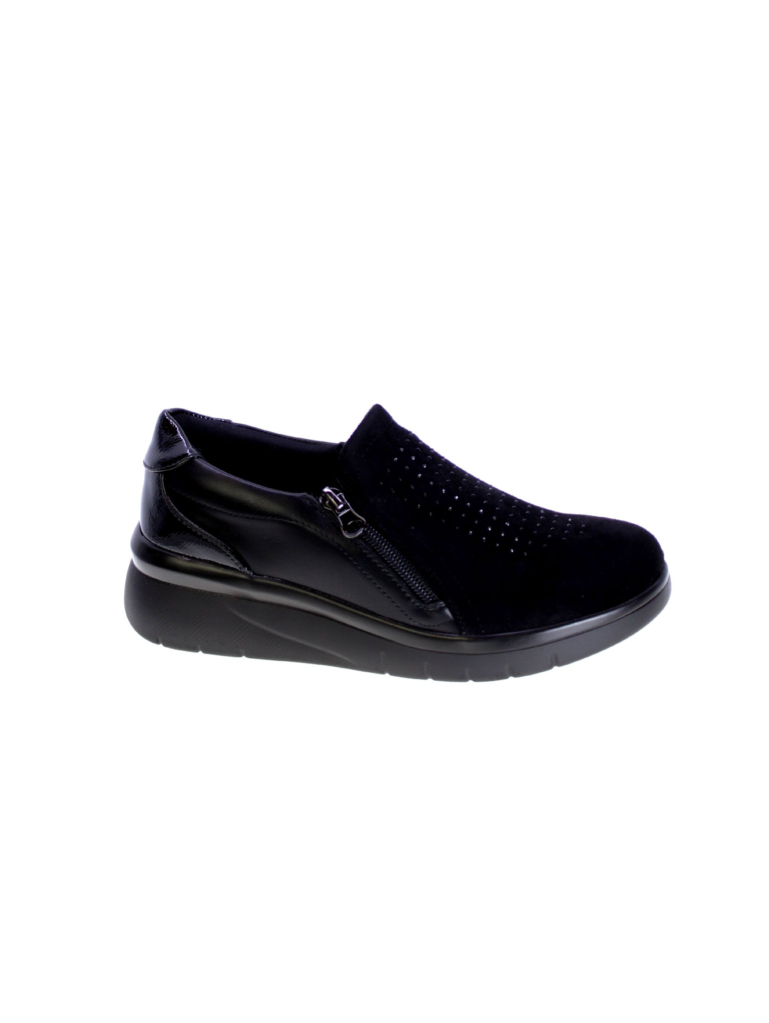 profilo vernice su tallone con tomaia in vegano, elastico laterale interno e zip esterno per