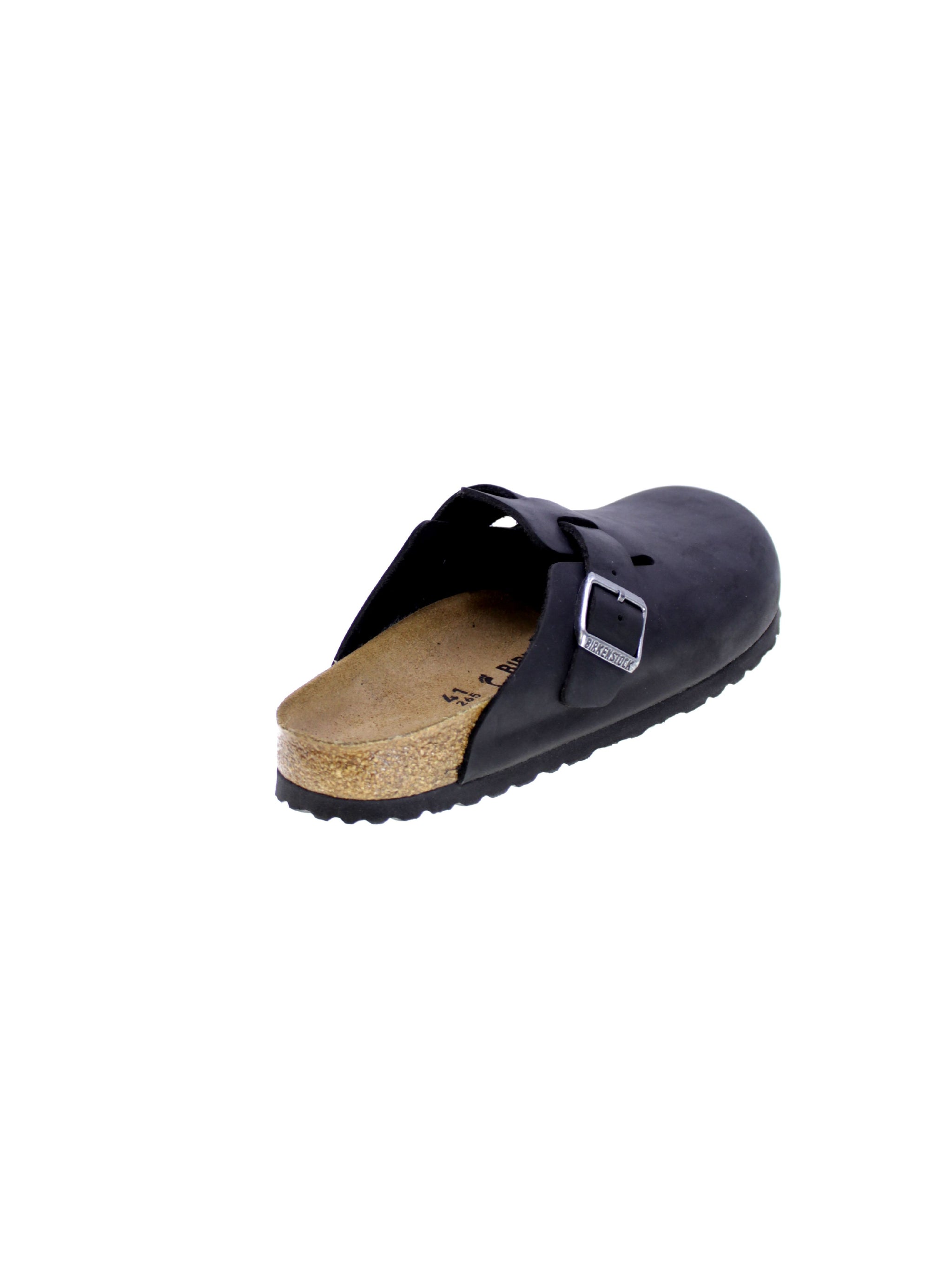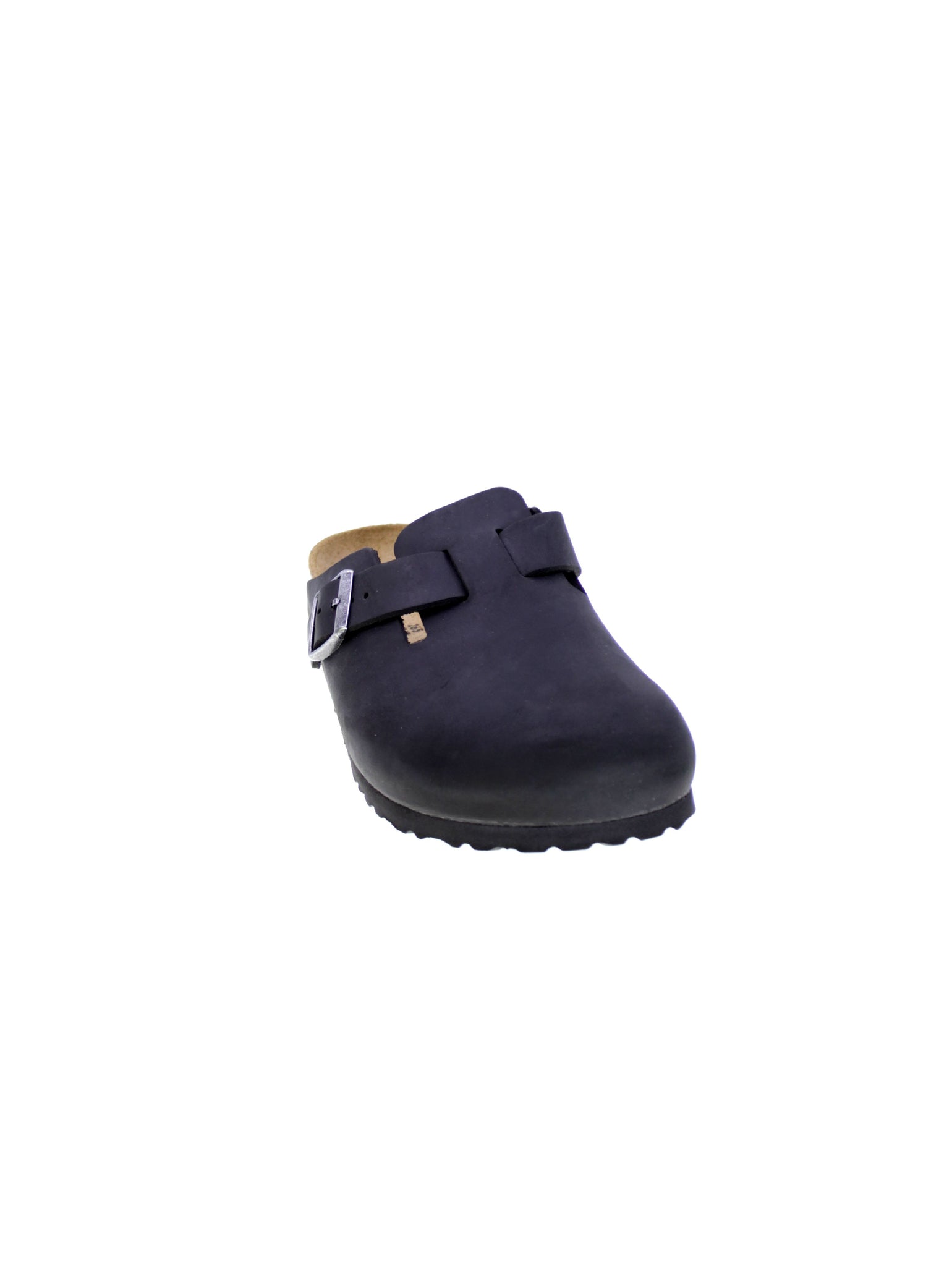 Sabot in pelle oliata colore nero, fibbia regolabile.