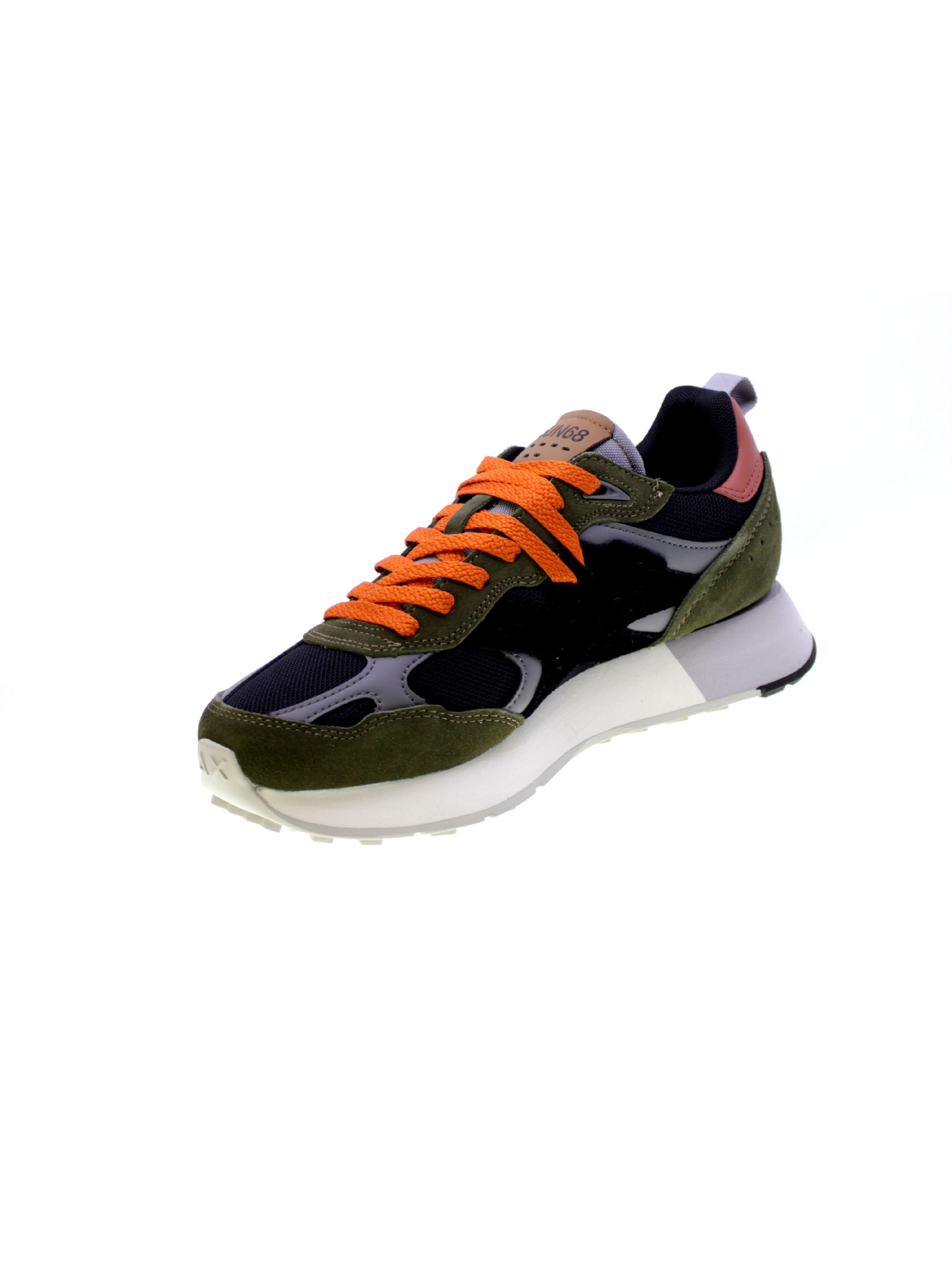 Sneakers in tessuto microforato colore nero, puntale passa lacci e tallone in camoscio verde militare, logo pvc bianco su inserto camoscio nero e pelle grigio, topino pelle marrone mattone, 6+1 occhielli e asola lacci arancio inclusi sostituzione nero, rivestimento interno in tessuto traspirante nero, sottopiede in tessuto removibile, suola in gomma leggera bicolore.
