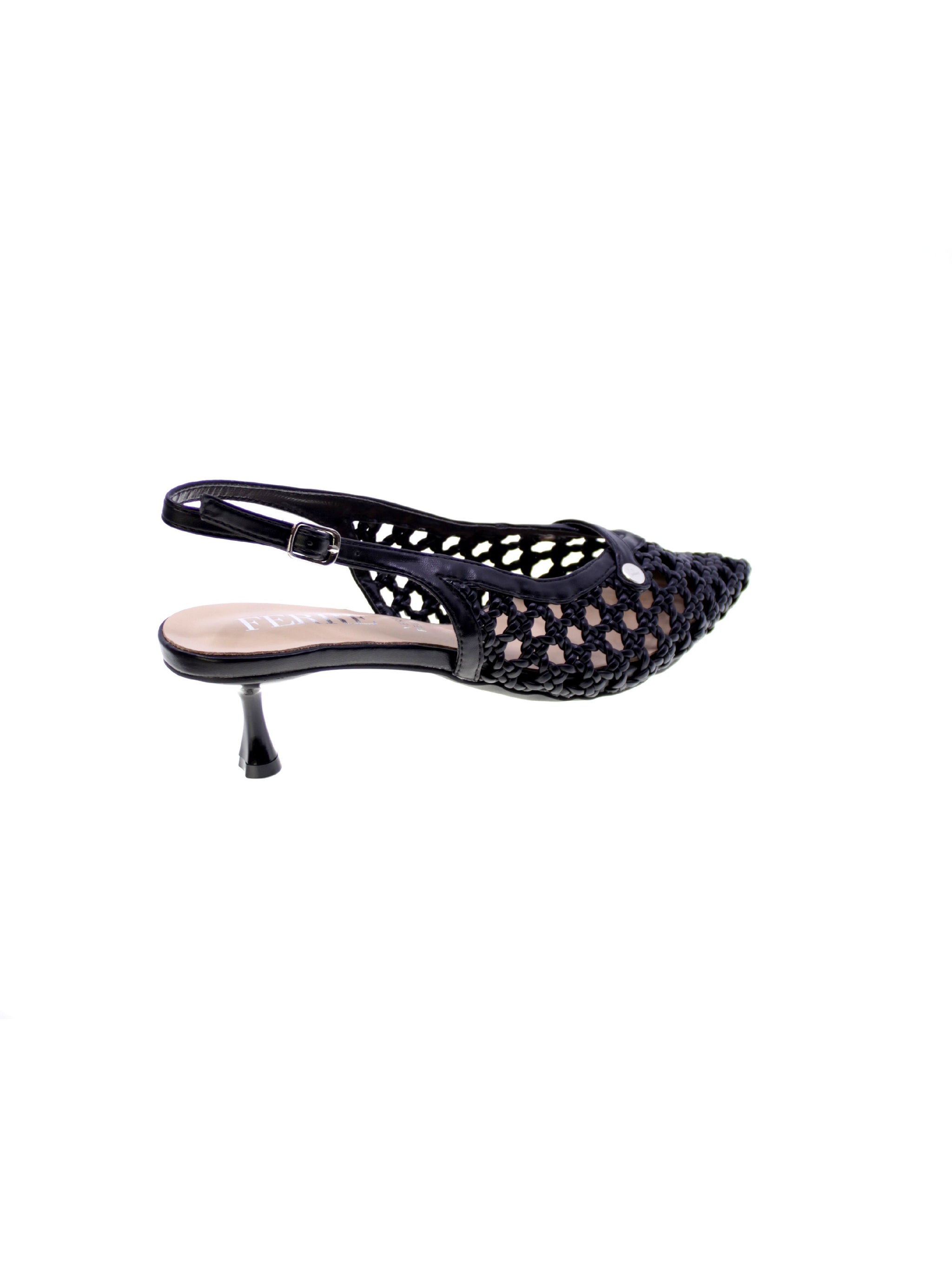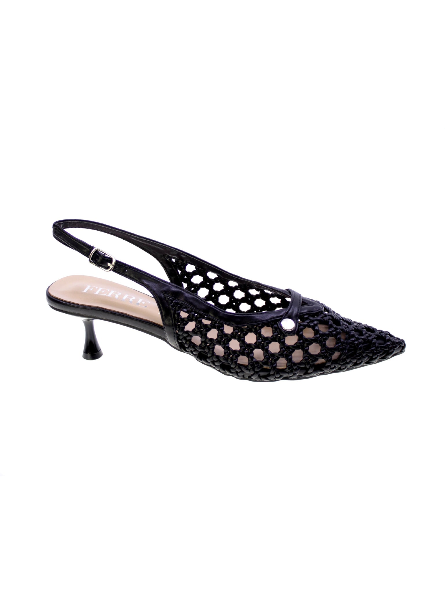 Eleganza e leggerezza si fondono perfettamente in questa décolleté Ferre. Realizzata in raffinato materiale intrecciato nero, presenta un design a punta affusolata con cinturino posteriore regolabile per una calzata personalizzata. Il tacco da 55mm conferisce slancio e femminilità, mentre la struttura traforata assicura traspirabilità e comfort. Ideale per un look sofisticato, è la scelta perfetta per chi cerca stile e praticità. Scegli la bellezza senza compromessi.