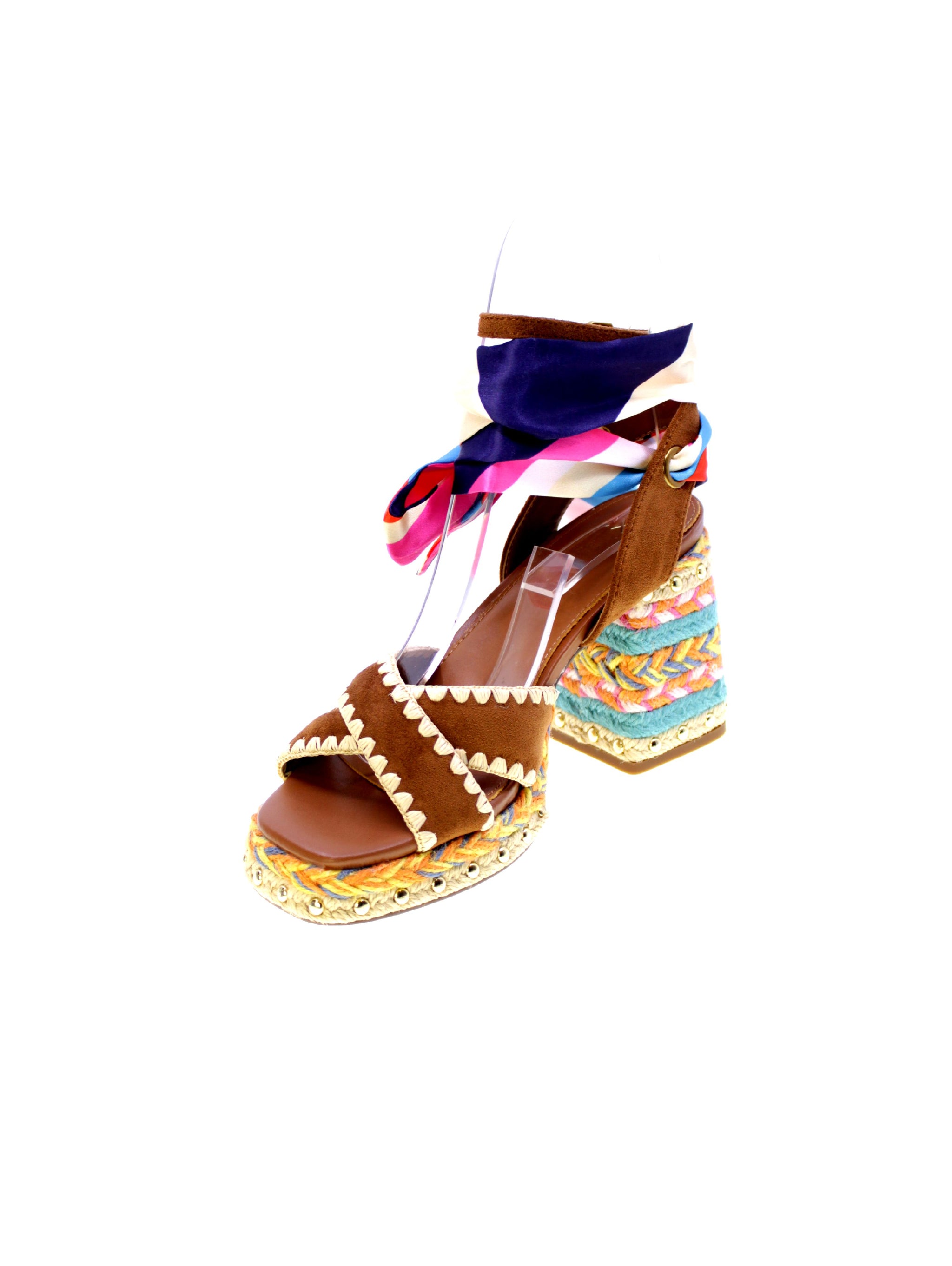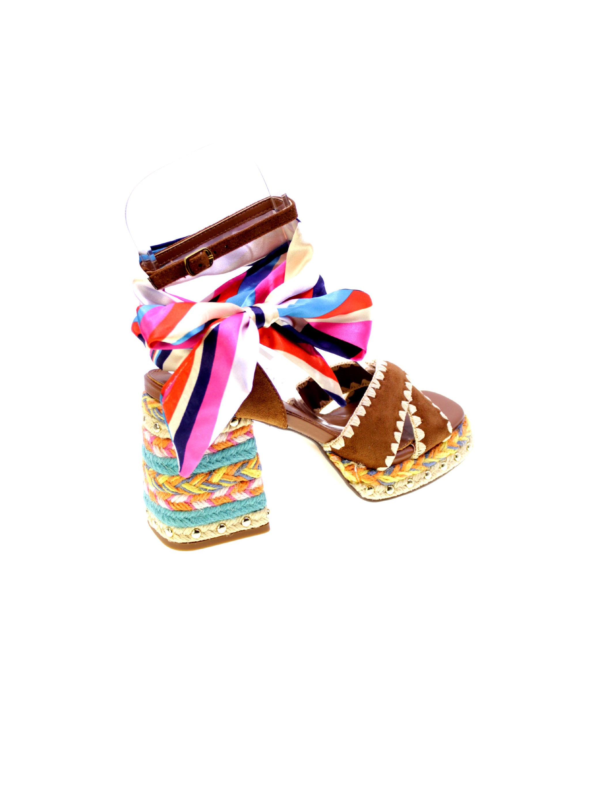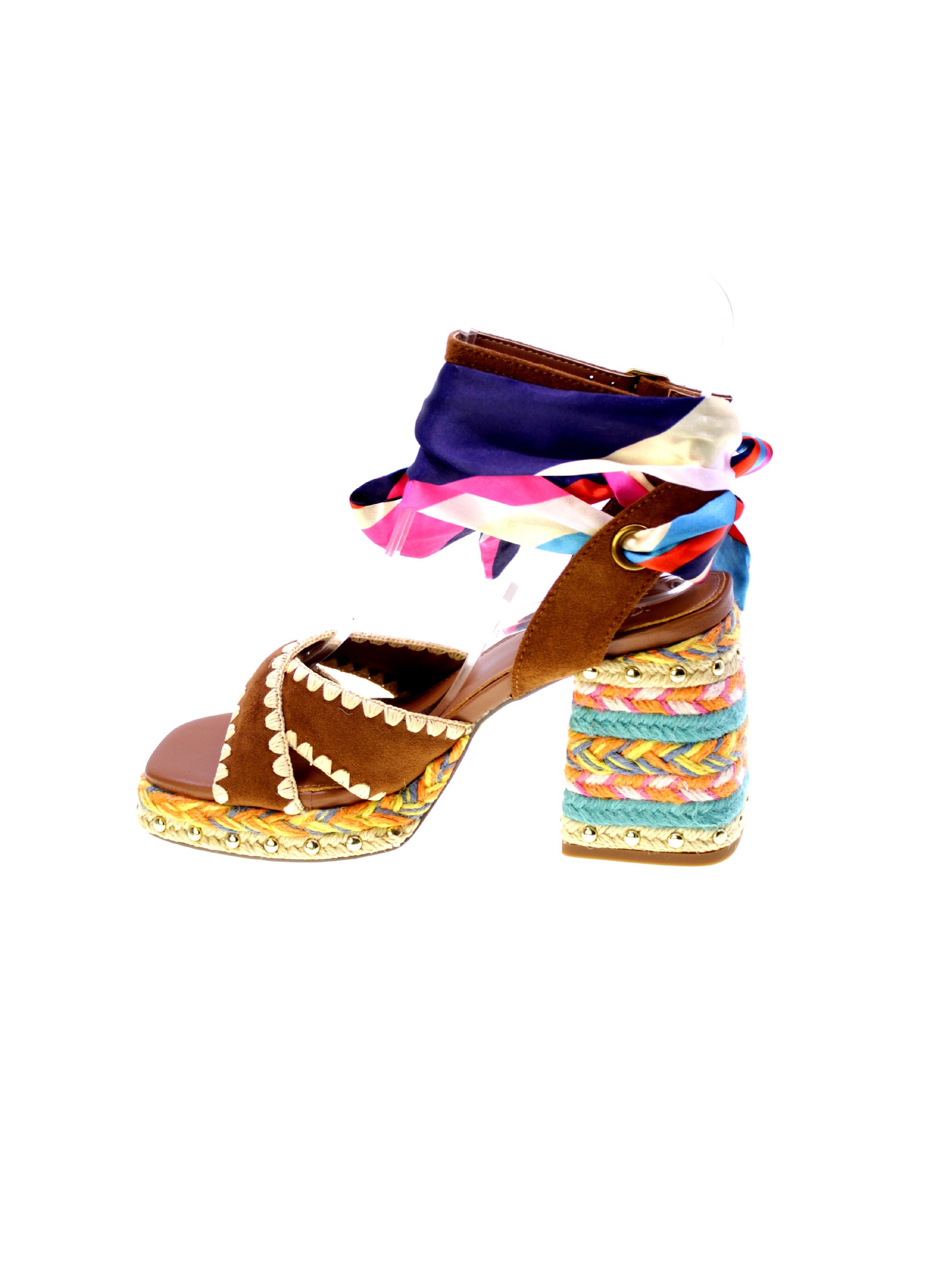 Sandalo Havana di EXE, un'esplosione di stile e colori per chi ama distinguersi. Decorato con un foulard multicolore che avvolge elegantemente la caviglia, presenta fascette in pelle scamosciata marrone con dettagli a zig-zag. Il tacco robusto di 90mm con plateau in corda intrecciata multicolore offrono comodità e stabilità. Ideale per un look estivo audace, questo sandalo coniuga perfettamente comfort e design accattivante. Scegli il tuo nuovo alleato di stile per occasioni uniche.