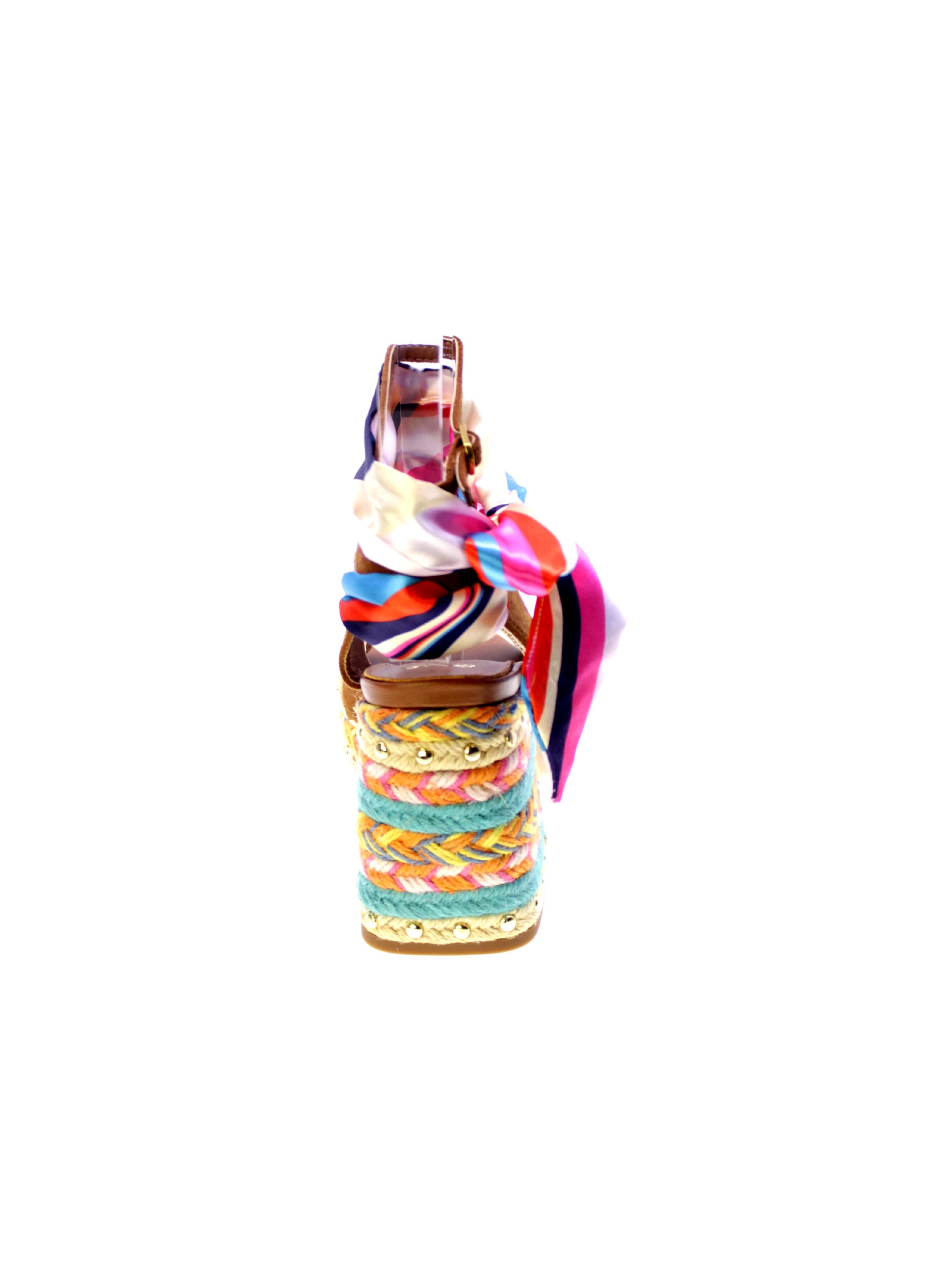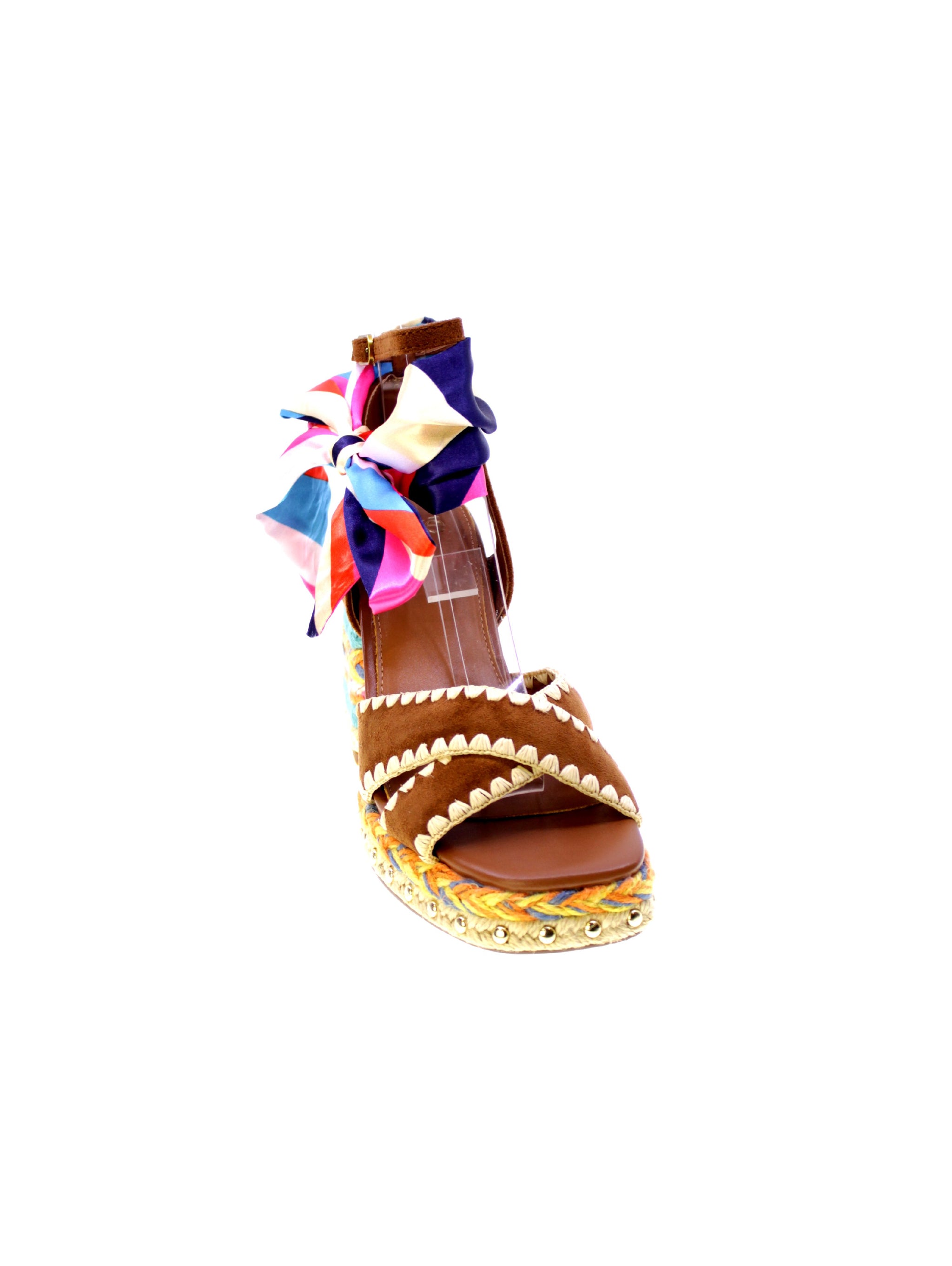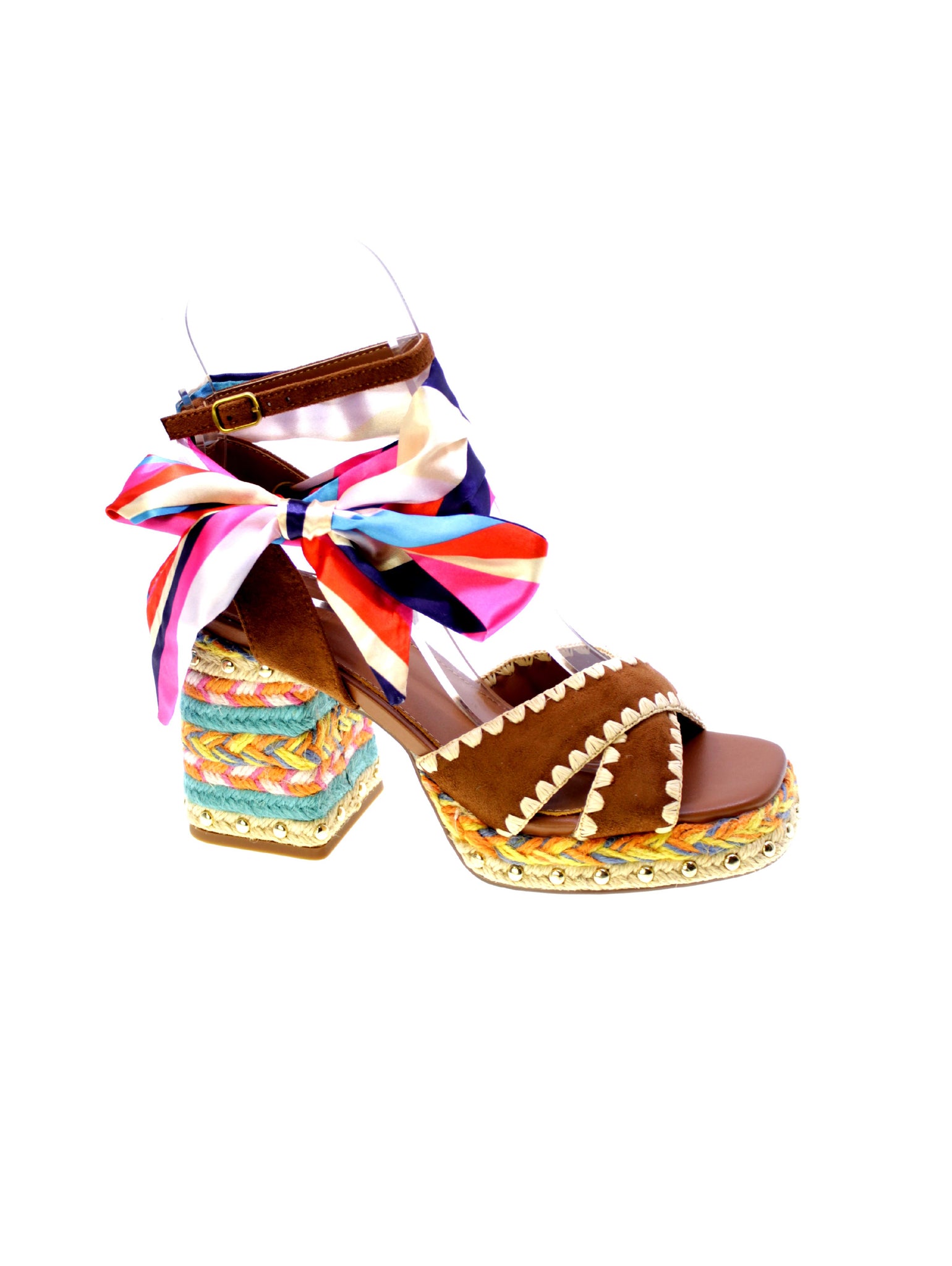 Sandalo Havana di EXE, un'esplosione di stile e colori per chi ama distinguersi. Decorato con un foulard multicolore che avvolge elegantemente la caviglia, presenta fascette in pelle scamosciata marrone con dettagli a zig-zag. Il tacco robusto di 90mm con plateau in corda intrecciata multicolore offrono comodità e stabilità. Ideale per un look estivo audace, questo sandalo coniuga perfettamente comfort e design accattivante. Scegli il tuo nuovo alleato di stile per occasioni uniche.