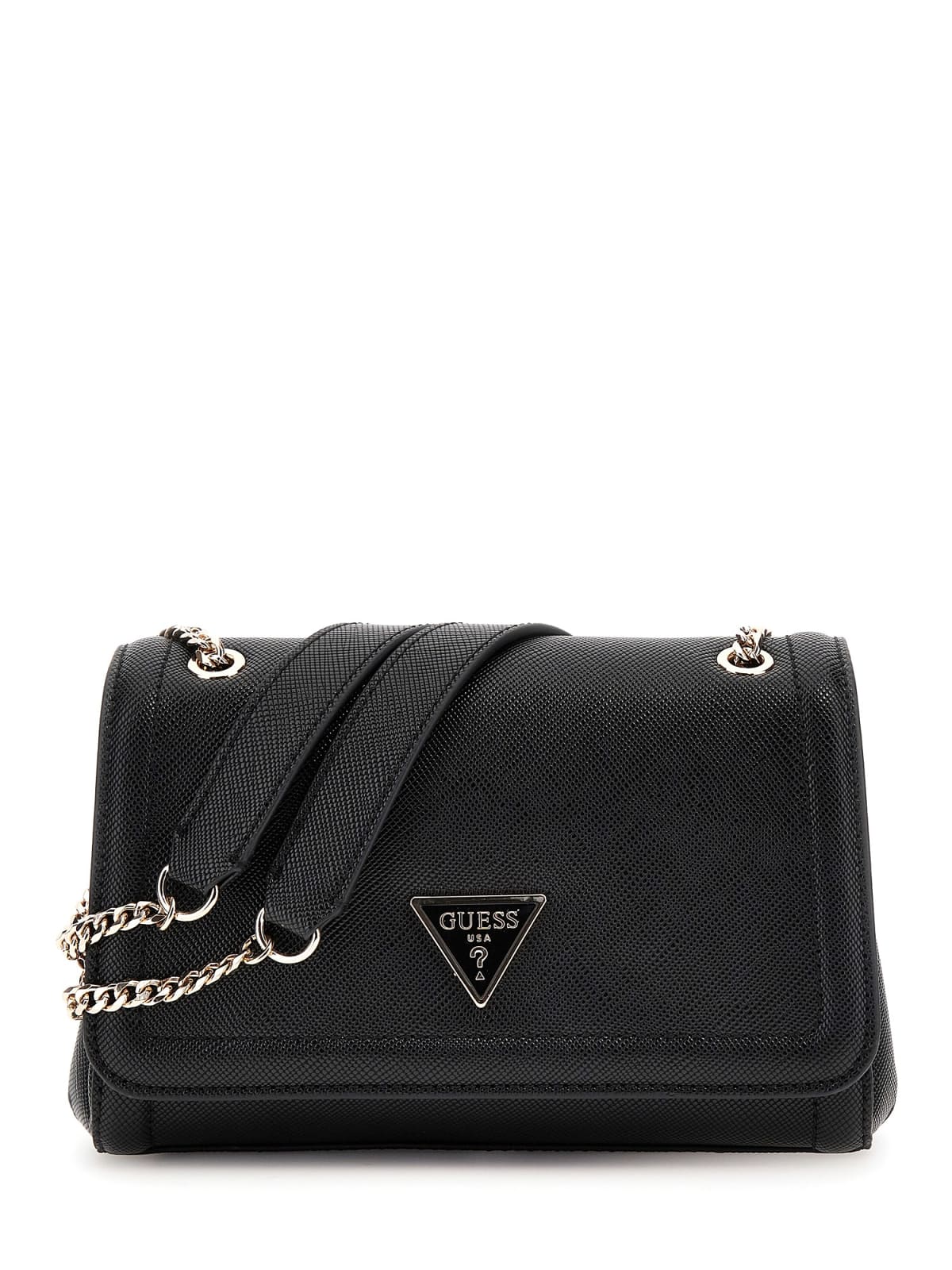 Elegante e sofisticata, la borsa a tracolla Guess incarna la quintessenza dello stile moderno. Realizzata in simil pelle nera saffiano, presenta un distintivo logo triangolare in metallo dorato. La tracolla a catena conferisce un tocco di lusso, mentre la chiusura magnetica assicura praticità. Perfetta per ogni occasione, completa il tuo outfit con un accessorio che unisce funzionalità e glamour. Scopri l'eleganza senza tempo di Guess e lasciati conquistare dal suo fascino.