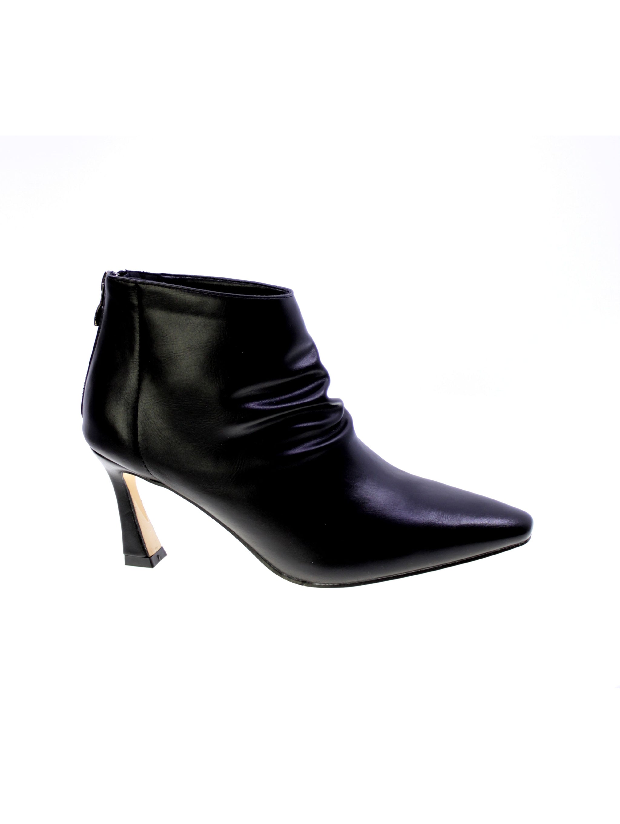 Tronchetto in morbido vegano colore nero con arricciatura sul gambale anteriore, zip su tallone per facilitare la calzata, rivestimento interno in tessuto traspirante, sottopiede morbido in vegano, tacco rivestito 80mm, suola sintetico antiscivolo.