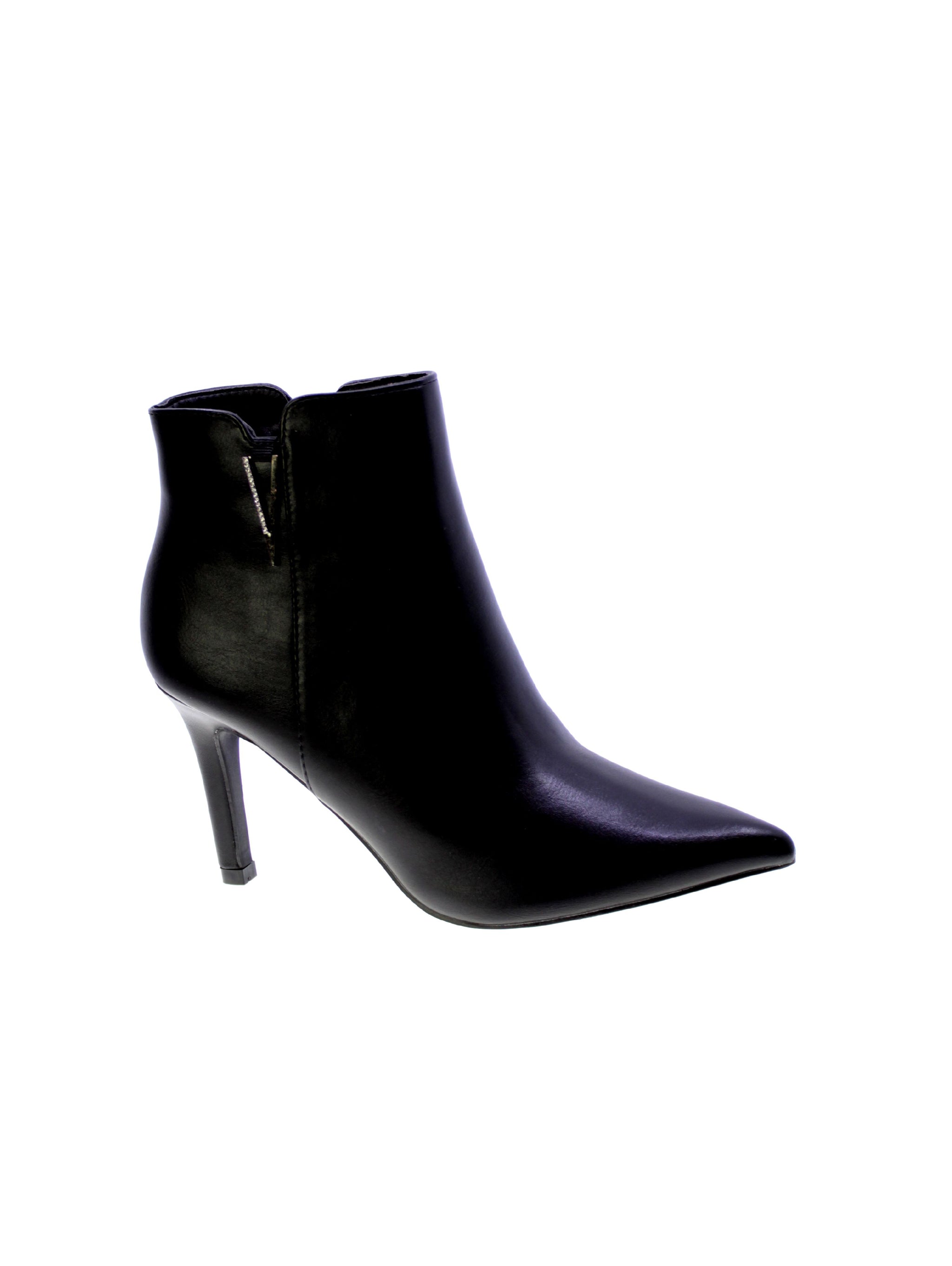 Tronchetto in morbido vegano colore nero, accessorio lateralecon micro strass, zip laterale interna per facilitare la calzata, rivestimento interno in tessuto caldo, sottopiede morbido in vegano, tacco rivestito 90mm, suola sintetico antiscivolo.