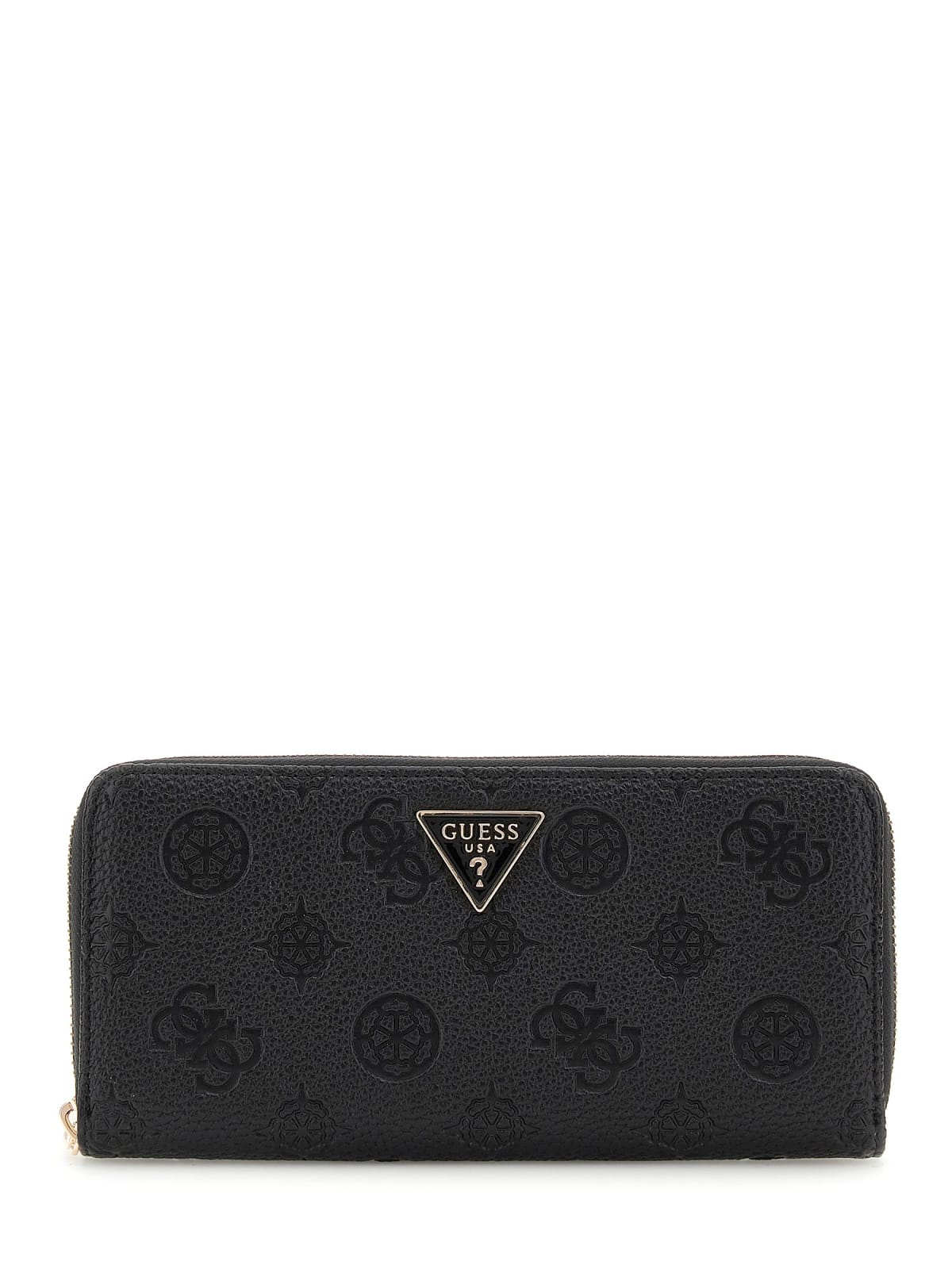 Portafoglio in simil pelle colore nero stampa impresso peony logo,triangolo metallo centrale, interno due scomparti per documenti banconote e carte, scomparto zip per monete, scomparto con zip posteriore, chiusura centrale con zip,polsiera tirante removibile. • Altezza: 10 cm• Lunghezza: 20 cm• Larghezza: 2,5 cm