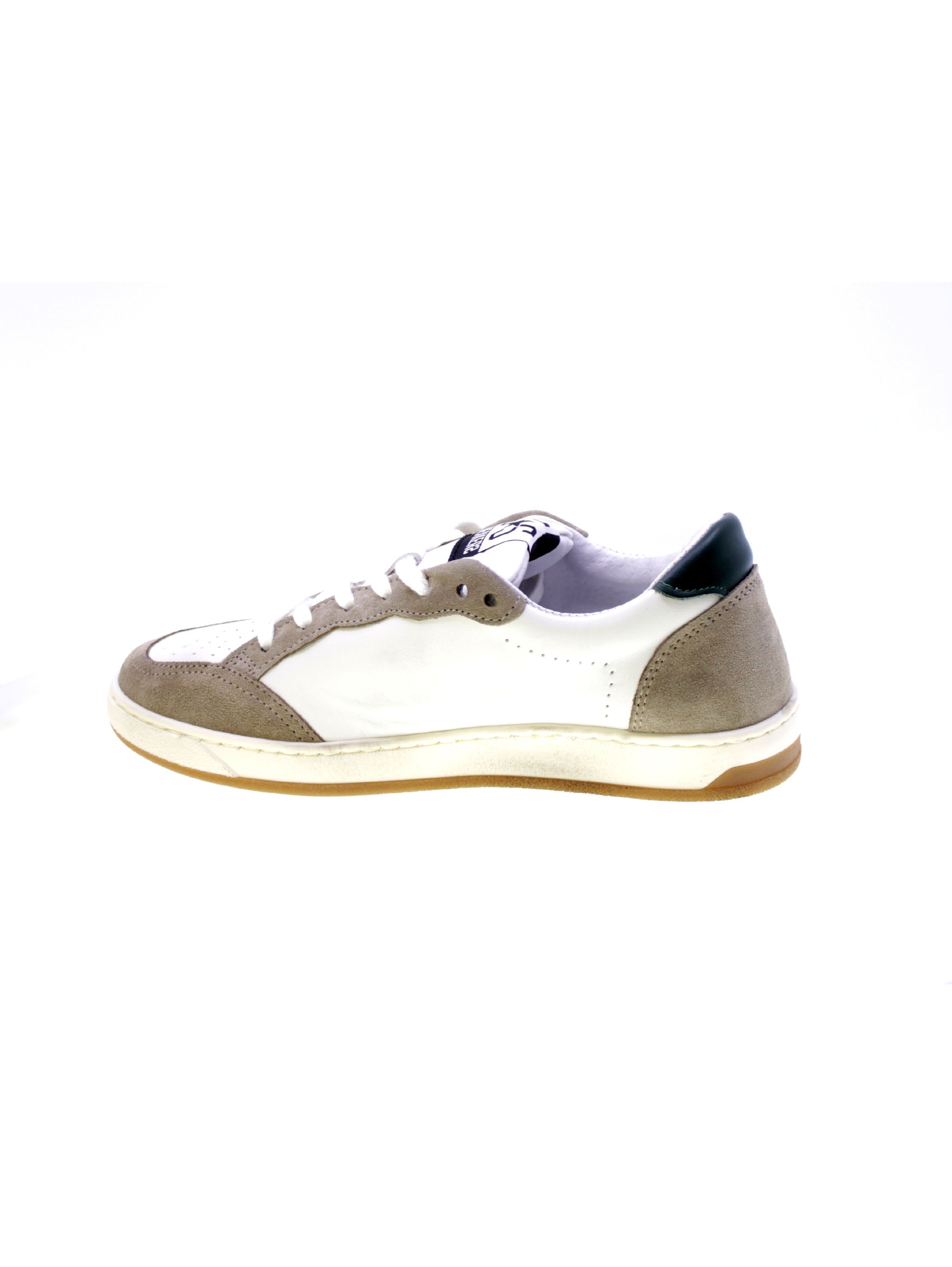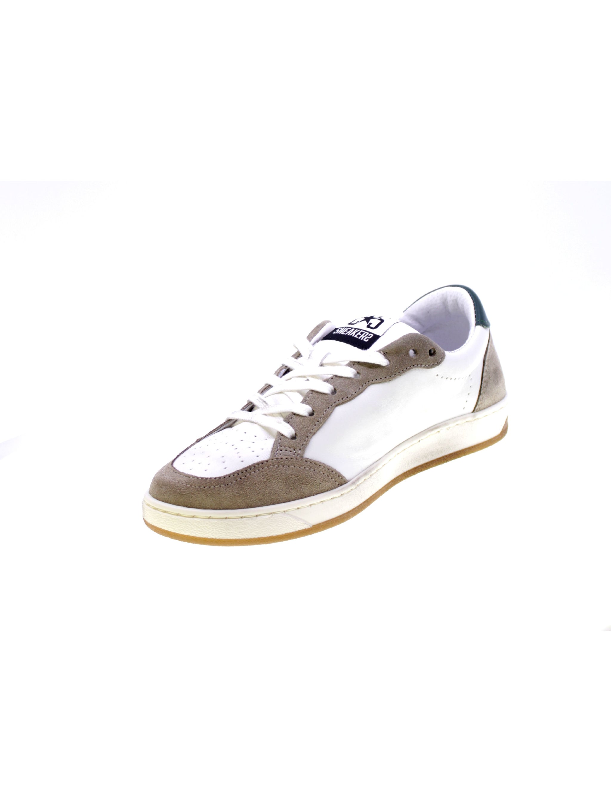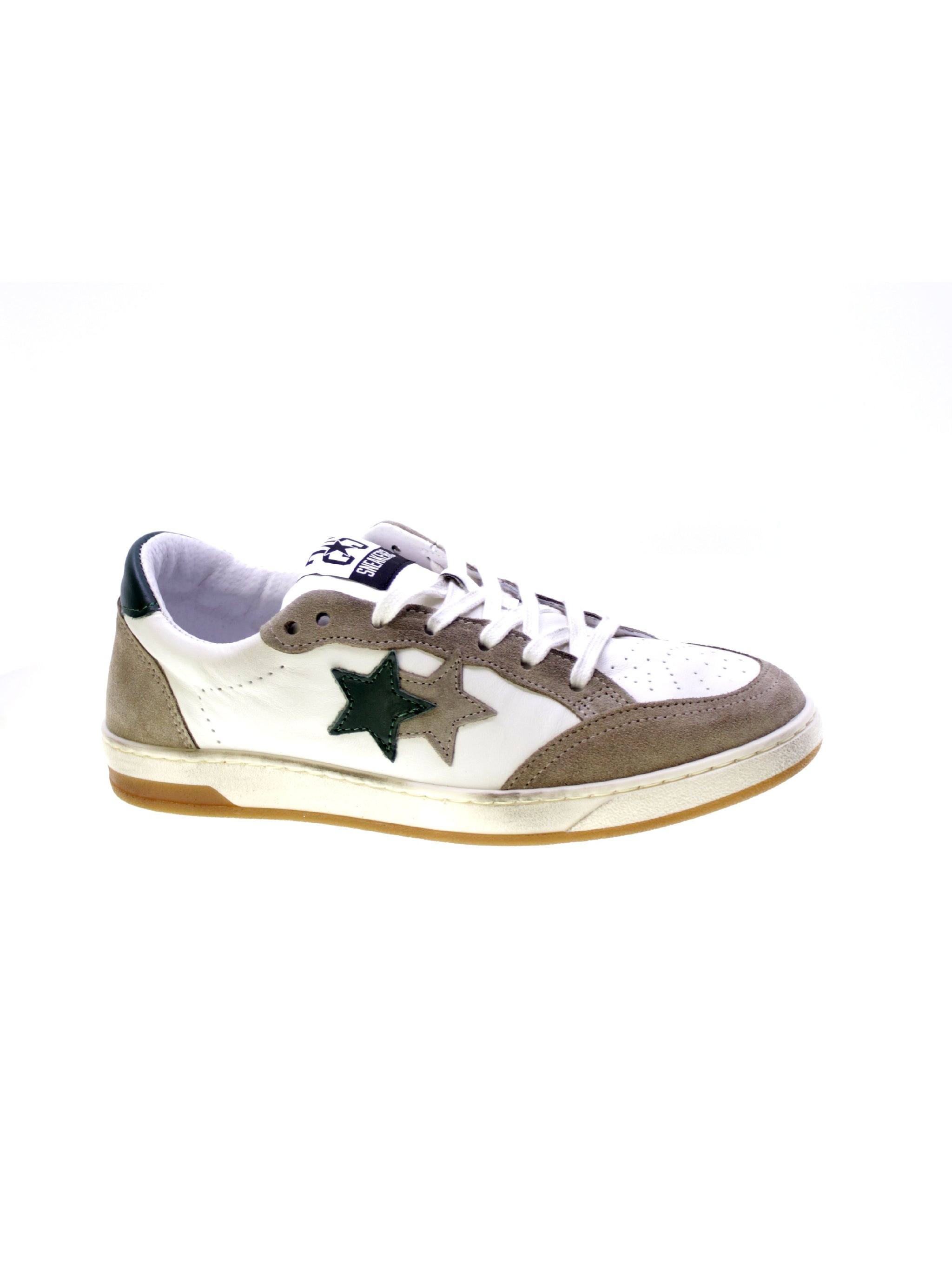 Sneakers allacciata bassa in morbida pelle colore bianco, inserti in camoscio taupe, toppino in pelle verde, 5+2 occhielli con lacci bianco effetto used, logo stelle applicati pelle verde e camoscio taupe, rivestimento interno in pelle,sottopiede pelle ergonomico estraibile con rialzo 20mm, suola in gomma effetto used.