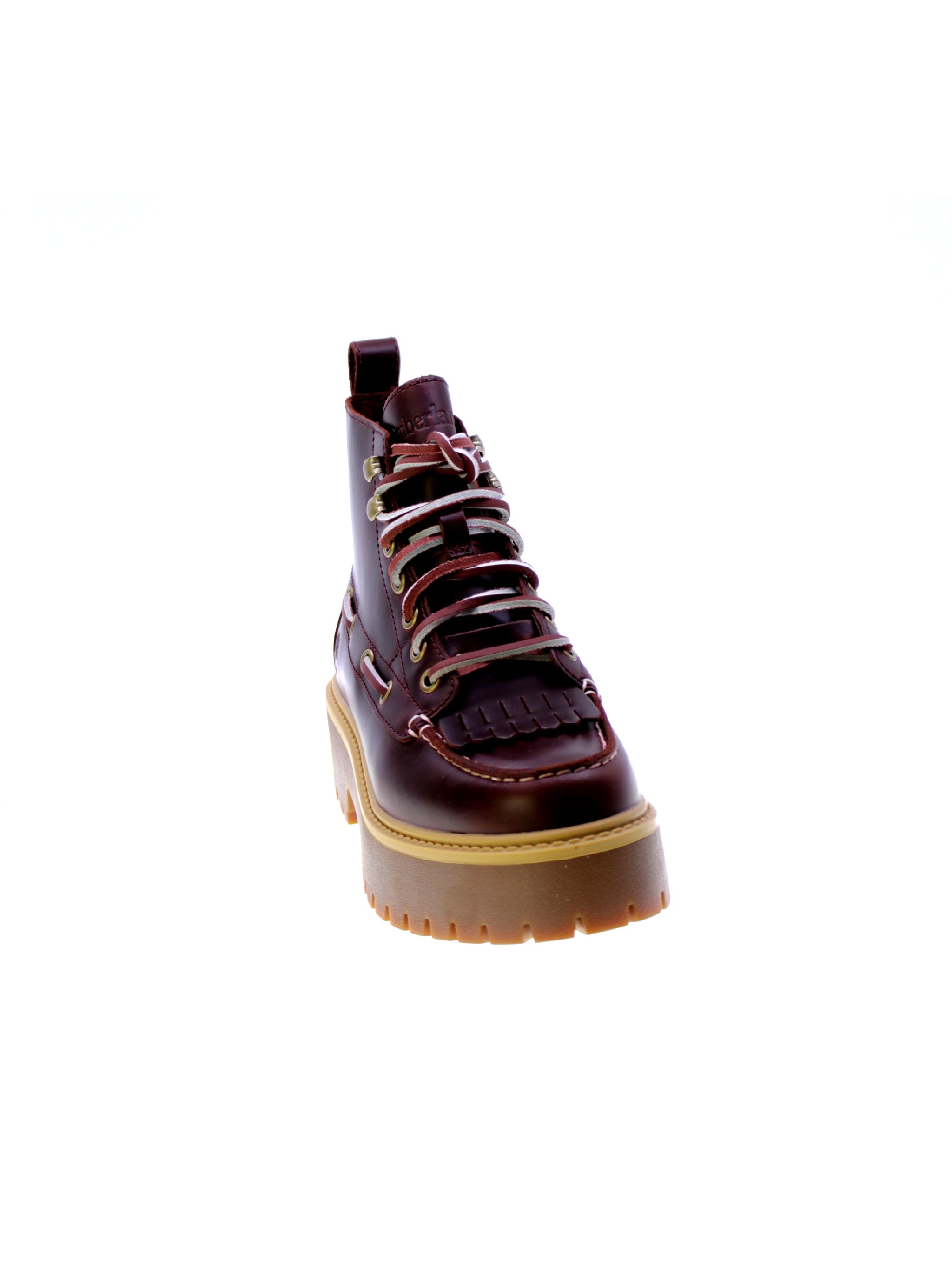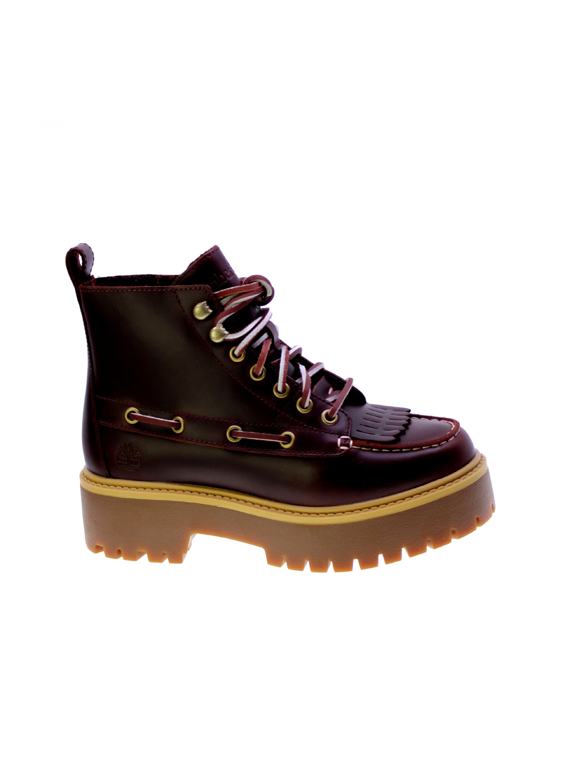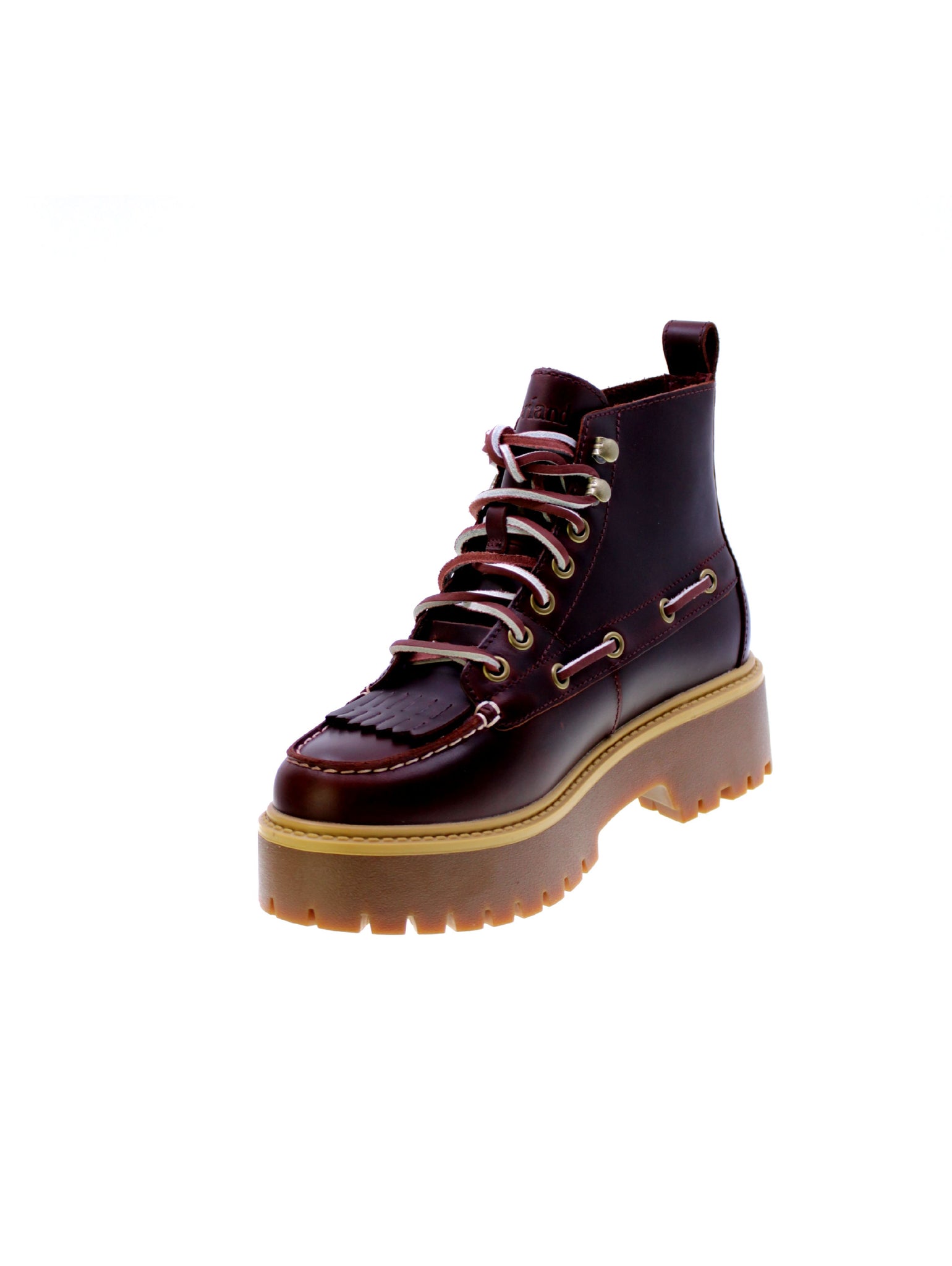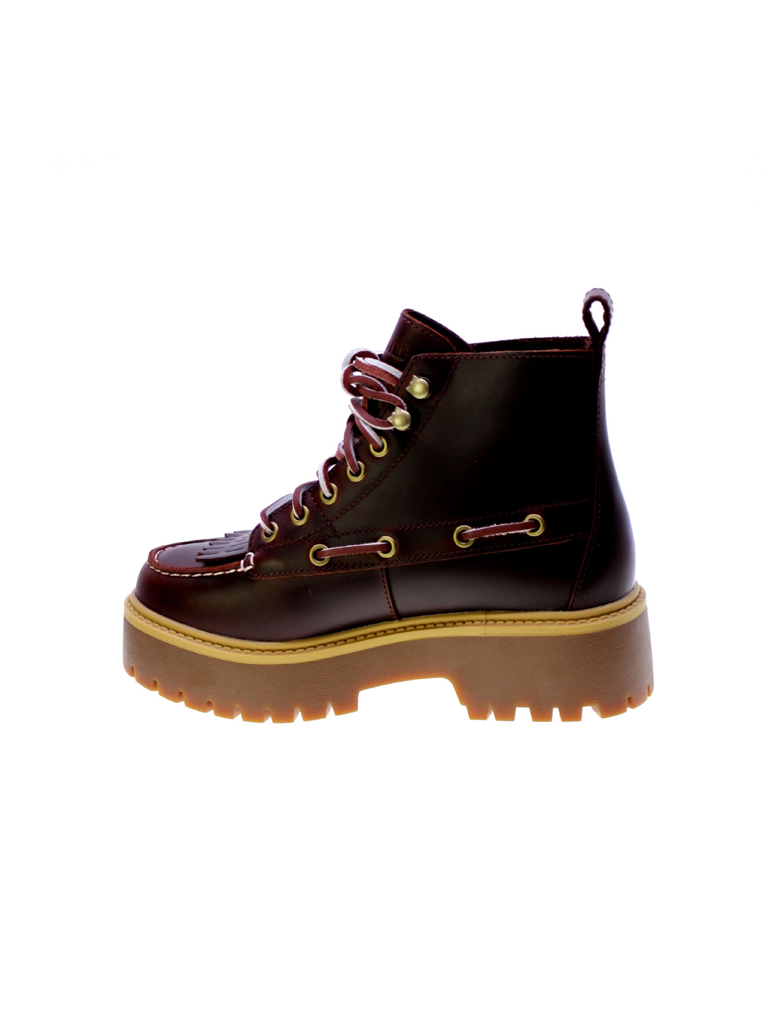 Stivaletto sfrangiato in pelle colore rosso scuro, rivestimento interno in tessuto e plastica riciclata, 5 occhielli + 2 asole rinforzati con lacci bicolore,sottopiede in tessuto removibile memory foam Ortholite, rinforzo in acciaio per arco plantare, suola plateau in gomma carro.